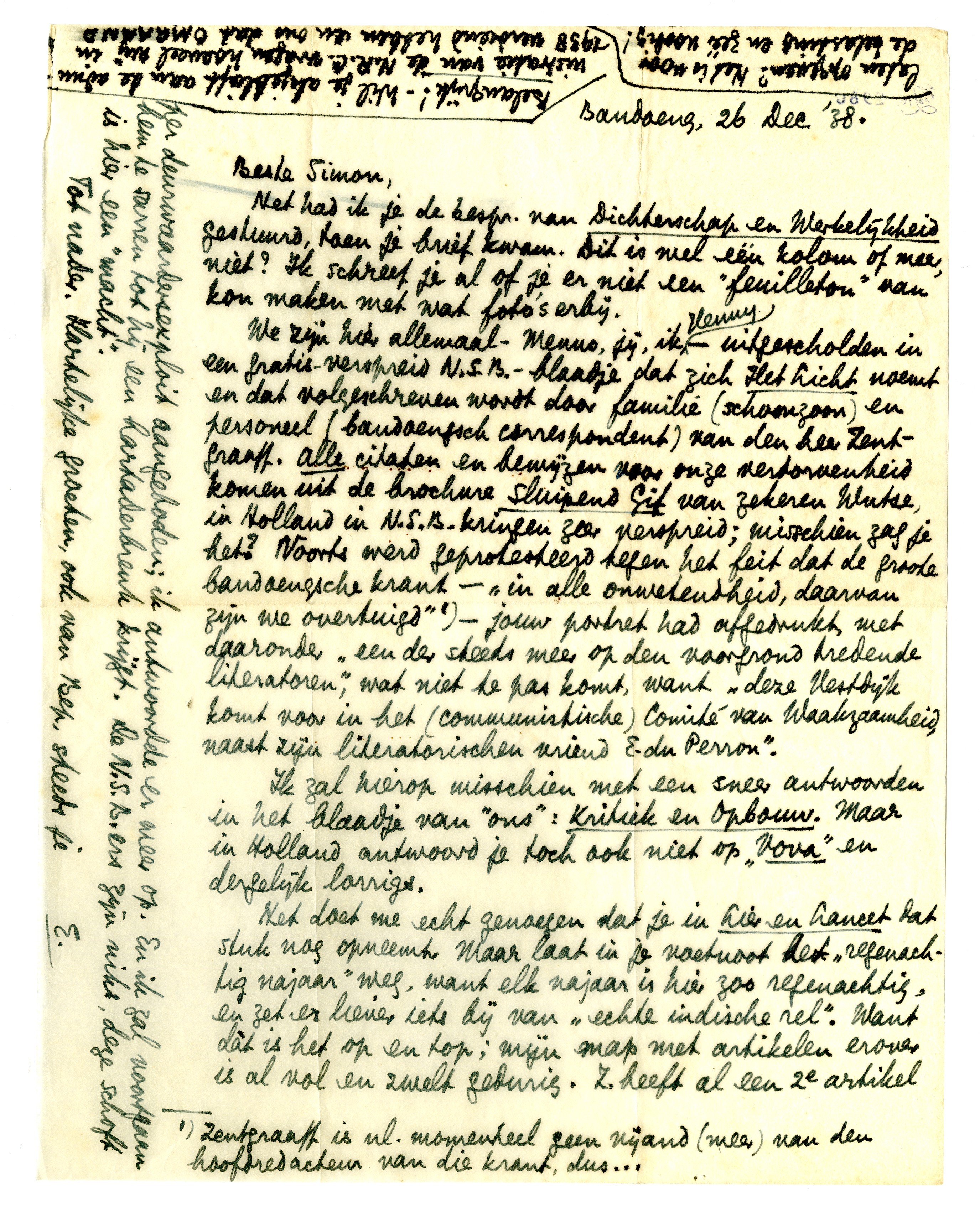 We zijn hier allemaal - Menno, jij, ik, Henny - uitgescholden in een gratis-verspreid N.S.B.-blaadje dat zich Het Licht noemt en dat volgeschreven wordt door familie (schoonzoon) en personeel (bandoengsch correspondent) van den heer Zentgraaff.5770 Alle citaten en bewijzen voor onze verdorvenheid komen uit de brochure Sluipend Gif van zekere Wutse, in Holland in N.S.B.-kringen zeer verspreid; misschien zag je het? Voorts werd geprotesteerd tegen het feit dat de groote bandoengsche krant - ‘in alle onwetendheid, daarvan zijn we overtuigd’* - jouw portret had afgedrukt,5771 met daaronder ‘een der steeds meer op den voorgrond tredende literatoren’, wat niet te pas komt, want ‘deze Vestdijk komt voor in het (communistische) Comité van Waakzaamheid, naast zijn literatorischen vriend E. du Perron’.
