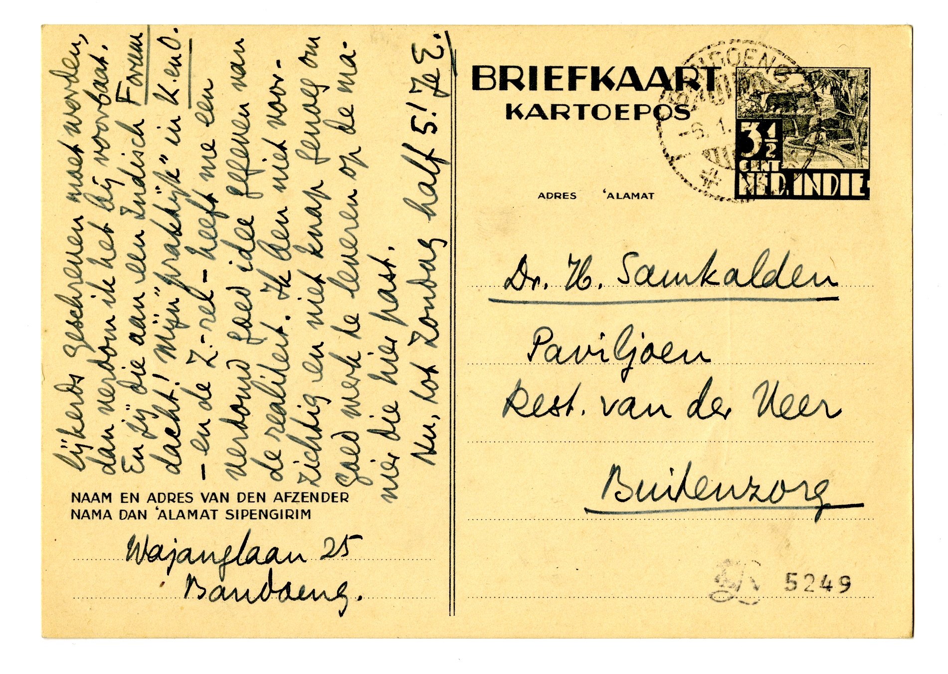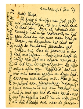 Ik kreeg 2 briefjes van Job, zelfs met inlichtingen, die nu wschl. toch te laat zijn. Dwz. ik schrapte die zinnetjes uit mijn antwoord, en heb geen lust om nu weer naar Koch te loopen, die bovendien het stuk al naar de drukkerij gezonden zal hebben enz. Dus in zooverre is het toch misgegaan. - Overigens heeft de uitleg van Job me alweer verzoend; ik heb hem teruggeschreven. De algemeene sfeer van ‘halfheid’ zal me wel meer parten spelen in dezen tijd. Daarover mondeling meer. Hoe je mijn ongeloof aan Noesantara ‘onzinnig’ kunt noemen is me een raadsel; wat wed je met me dat K. deze zaak ‘met eere’ omzeilen zal? En in ieder geval als dàt blaadje ook voor de fatsoenlijkerds geschreven moet worden, dan verdom ik het bij voorbaat. En jij die aan een Indisch Forum dacht! Mijn ‘praktijk’ in K. en O. - en de Z.-rel - heeft me een verdomd goed idee gegeven van de realiteit. Ik ben niet voorzichtig en niet knap genoeg om goed werk te leveren op de manier die hier past.