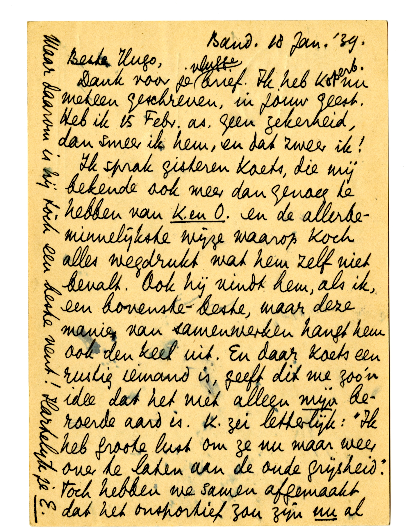 Dank voor je vlugge brief. Ik heb Koperb. nu meteen geschreven, in jouw geest. Heb ik 15 Febr. as. geen zekerheid, dan smeer ik hem, en dat zweer ik!