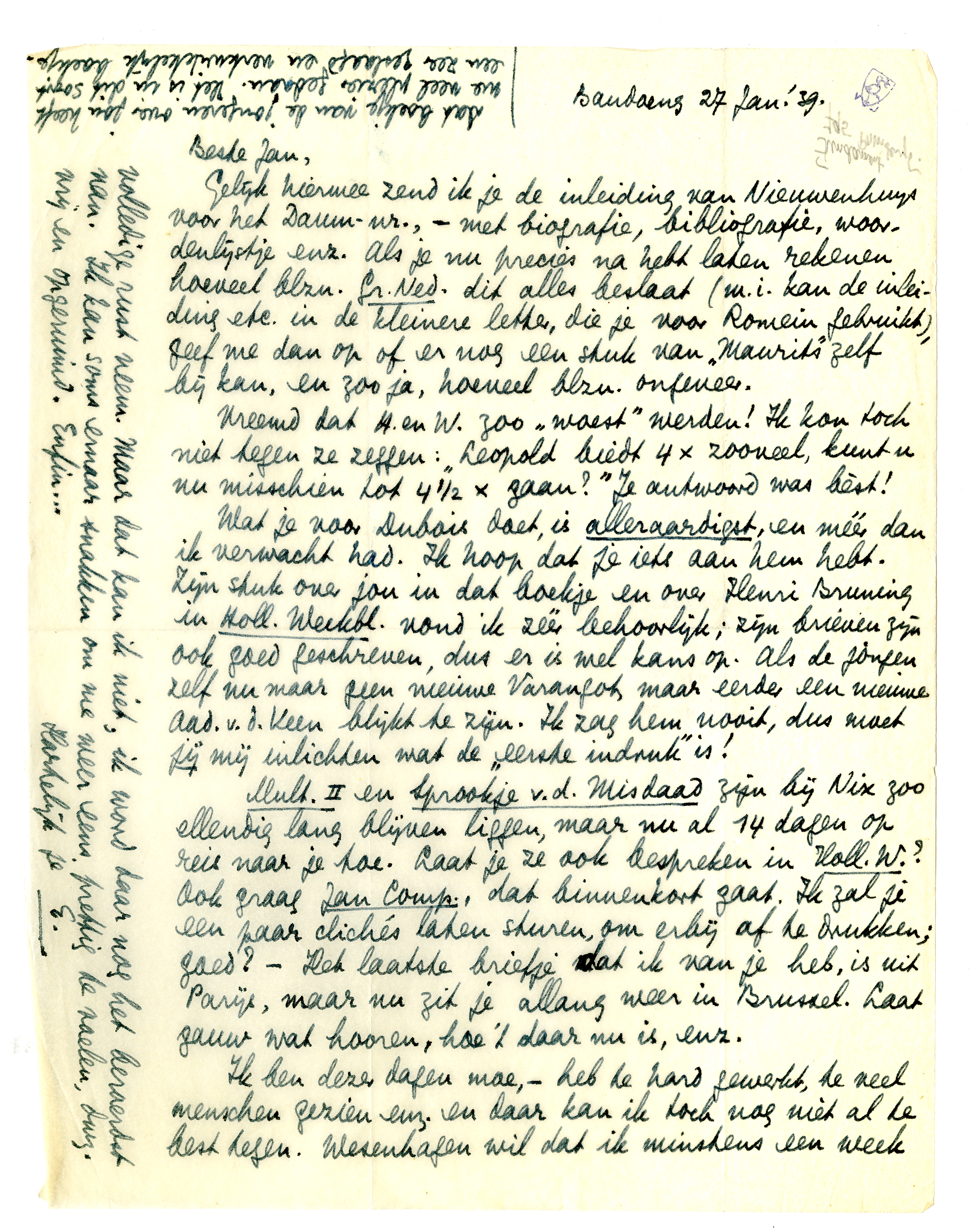 Wat je voor Dubois doet, is alleraardigst, en méér dan ik verwacht had. Ik hoop dat je iets aan hem hebt. Zijn stuk over jou in dat boekje5848 en over Henri Bruning5849 in Holl. Weekbl. vond ik zéér behoorlijk; zijn brieven zijn ook goed geschreven, dus er is wel kans op. Als de jongen zelf nu maar geen nieuwe Varangot, maar eerder een nieuwe Aad. v.d. Veen blijkt te zijn. Ik zag hem nooit, dus moet jij mij inlichten wat de ‘eerste indruk’ is!