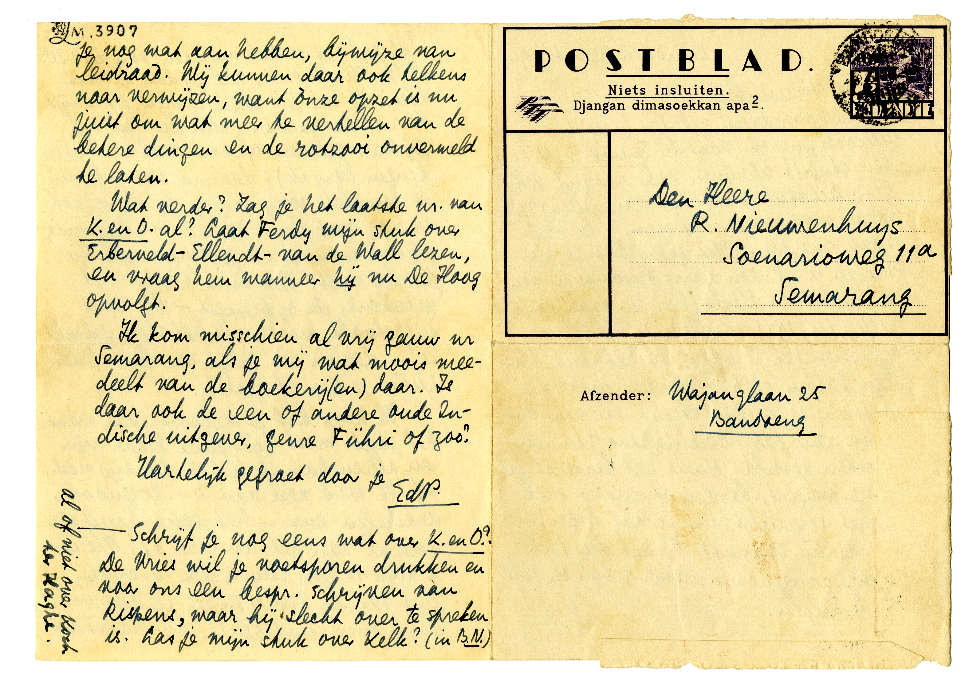 Wat verder? Zag je het laatste nr. van K. en O. al? Laat Ferdy5950 mijn stuk over Erberveld - Ellendt - van de Wall5951 lezen, en vraag hem wanneer hij nu De Hoog5952 opvolgt.