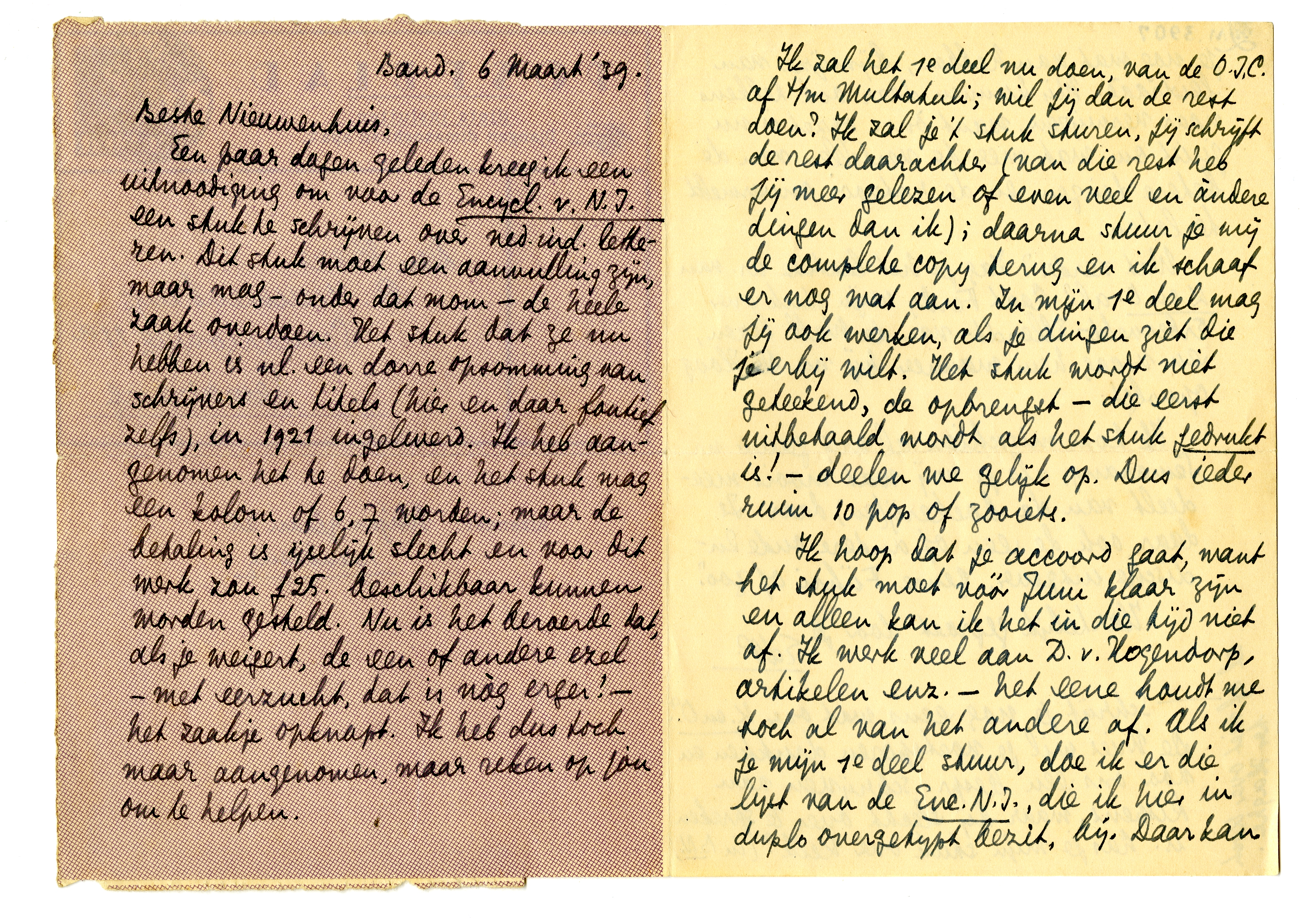 Een paar dagen geleden kreeg ik een uitnoodiging om voor de Encycl. v. N.I. een stuk te schrijven over ned. ind. letteren. Dit stuk moet een aanvulling zijn, maar mag - onder dat mom - de heele zaak overdoen. Het stuk dat ze nu hebben is nl. een dorre opsomming van schrijvers en titels (hier en daar foutief zelfs), in 1921 ingeleverd. Ik heb aangenomen het te doen, en het stuk mag een kolom of 6, 7 worden; maar de betaling is ijselijk slecht en voor dit werk zou f 25. beschikbaar kunnen worden gesteld. Nu is het beroerde dat, als je weigert, de een of andere ezel - met eerzucht, dat is nòg erger! - het zaakje opknapt. Ik heb dus toch maar aangenomen, maar reken op jou om te helpen.