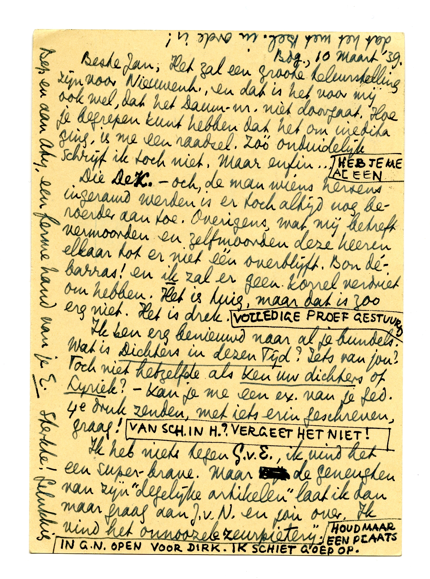 Beste Jan, Het zal een groote teleurstelling zijn voor Nieuwenh., en dat is het voor mij ook wel, dat het Daum-nr. niet doorgaat. Hoe je begrepen kunt hebben dat het om inedita ging, is me een raadsel. Zóó onduidelijk schrijf ik toch niet. Maar enfin...