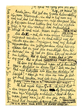 Klim niet meer op kasten en genees gauw. Ik schrijf spoedig beter; dit gaat in haast. Het beste met al jullie preparatieven, maar ik heb er toch wel eenig idee van, want wij zijn ook vertrokken, weet je?