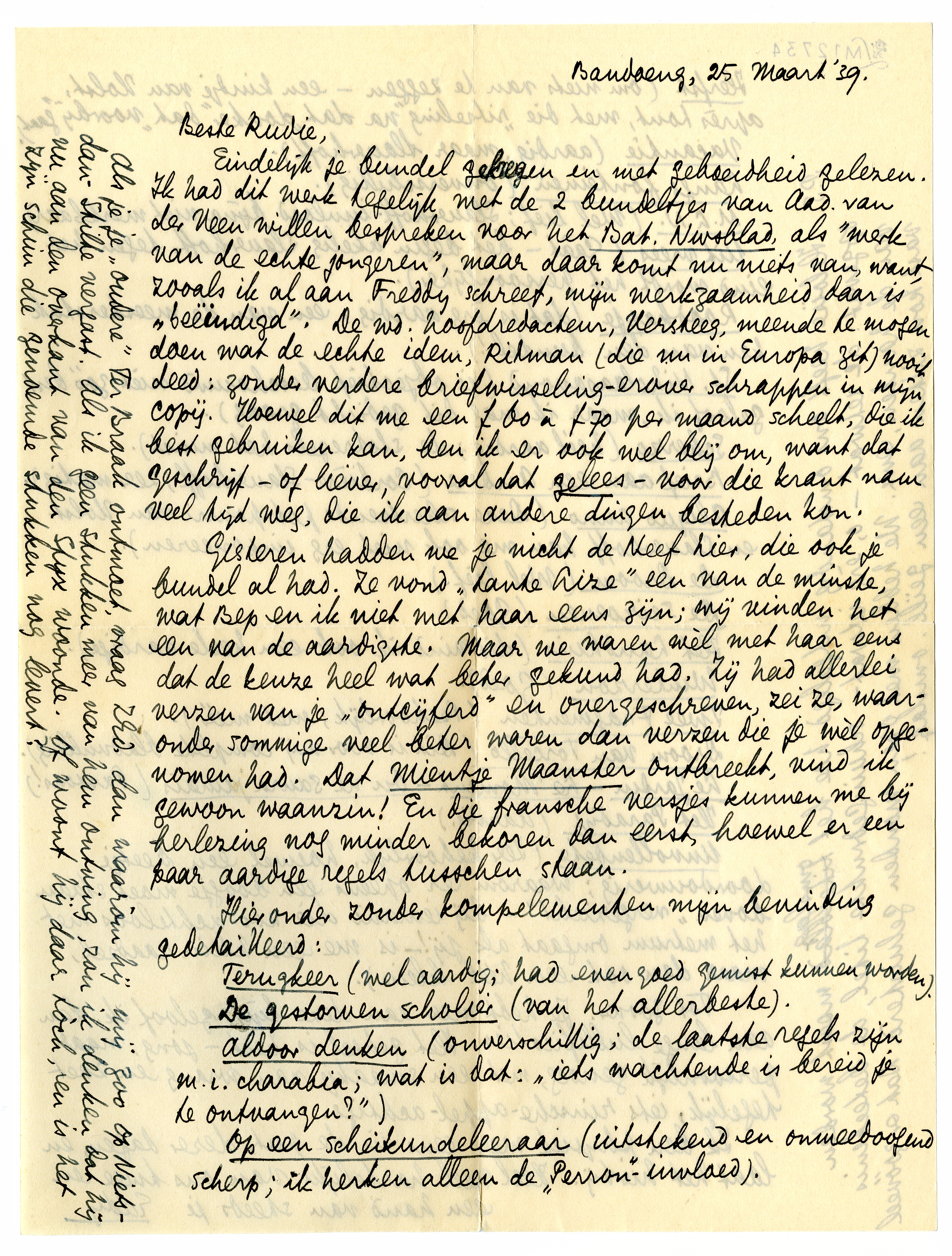 Eindelijk je bundel gekregen en met geboeidheid gelezen. Ik had dit werk tegelijk met de 2 bundeltjes van Aad. van der Veen willen bespreken voor het Bat. Nwsblad, als ‘werk van de echte jongeren’, maar daar komt nu niets van, want, zooals ik al aan Freddy schreef, mijn werkzaamheid daar is ‘beëindigd’. De wd. hoofdredacteur, Versteeg, meende te mogen doen wat de echte idem, Ritman (die nu in Europa zit) nooit deed: zonder verdere briefwisseling-erover schrappen in mijn copij. Hoewel dit me een f 60 à f 70 per maand scheelt, die ik best gebruiken kan, ben ik er ook wel blij om, want dat geschrijf - of liever, vooral dat gelees - voor die krant nam veel tijd weg, die ik aan andere dingen besteden kon.