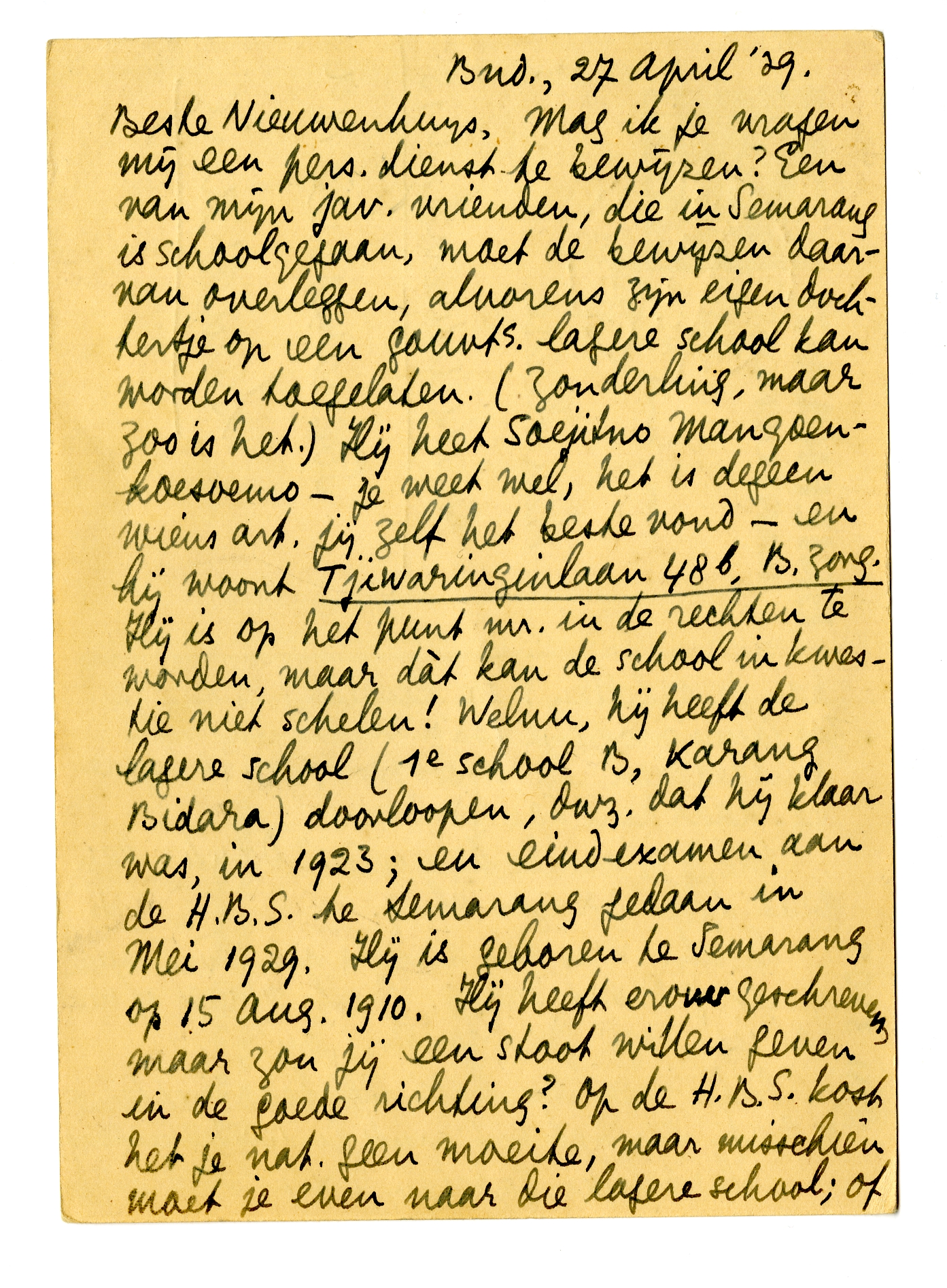 Beste Nieuwenhuys, Mag ik je vragen mij een pers. dienst te bewij-zen? Een van mijn jav. vrienden, die in Semarang is schoolgegaan, moet de bewijzen daarvan overleggen, alvorens zijn eigen dochtertje op een gouvts. lagere school kan worden toegelaten. (Zonderling, maar zoo is het.) Hij heet Soejitno Mangoenkoesoemo - je weet wel, het is degeen wiens art. jij zelf het beste vond - en hij woont Tjiwaringinlaan 48b, B. zorg. Hij is op het punt mr. in de rechten te worden, maar dàt kan de school in kwestie niet schelen! Welnu, hij heeft de lagere school (1e school B, Karang Bidara) doorloopen, dwz. dat hij klaar was, in 1923; en eind-examen aan de H.B.S. te Semarang gedaan in Mei 1929. Hij is geboren te Semarang op 15 Aug. 1910. Hij heeft erover geschreven, maar zou jij een stoot willen geven in de goede richting? Op de H.B.S. kost het je nat. geen moeite, maar misschien moet je even naar die lagere school; of kan je opbellen? De bedoeling is dat ze zoo gauw mogelijk zoo'n verklaring van eindexamen en afloopen v/die 1e lagere sch. naar hem toe zenden.