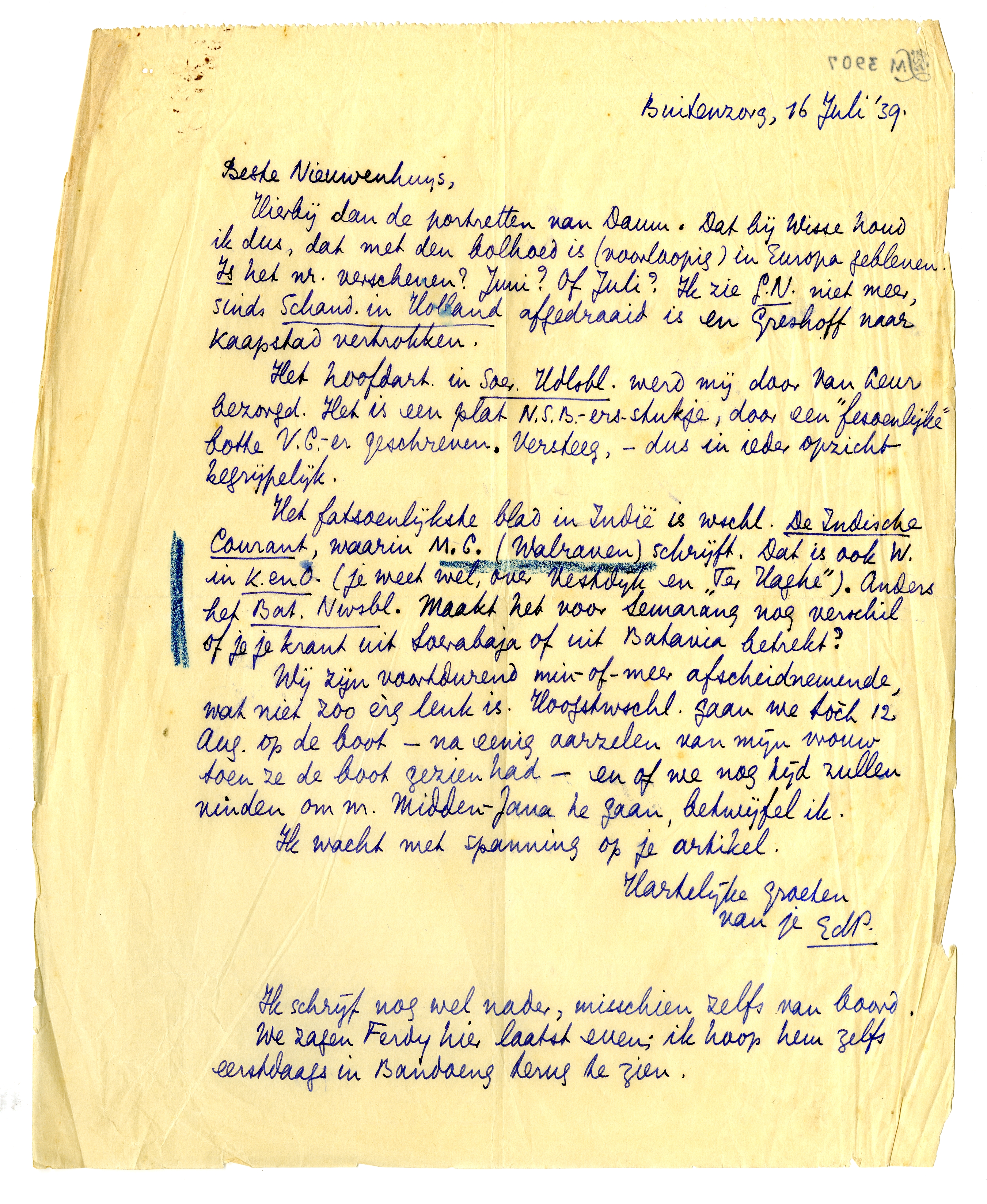 Het fatsoenlijkste blad in Indië is wschl. De Indische Courant, waarin M.C. (Walraven) schrijft. Dat is ook W. in K. en O. (je weet wel, over Vestdijk en ‘Ter Haghe’6152). Anders het Bat. Nwsbl. Maakt het voor Semarang nog verschil of je je krant uit Soerabaja of uit Batavia betrekt?