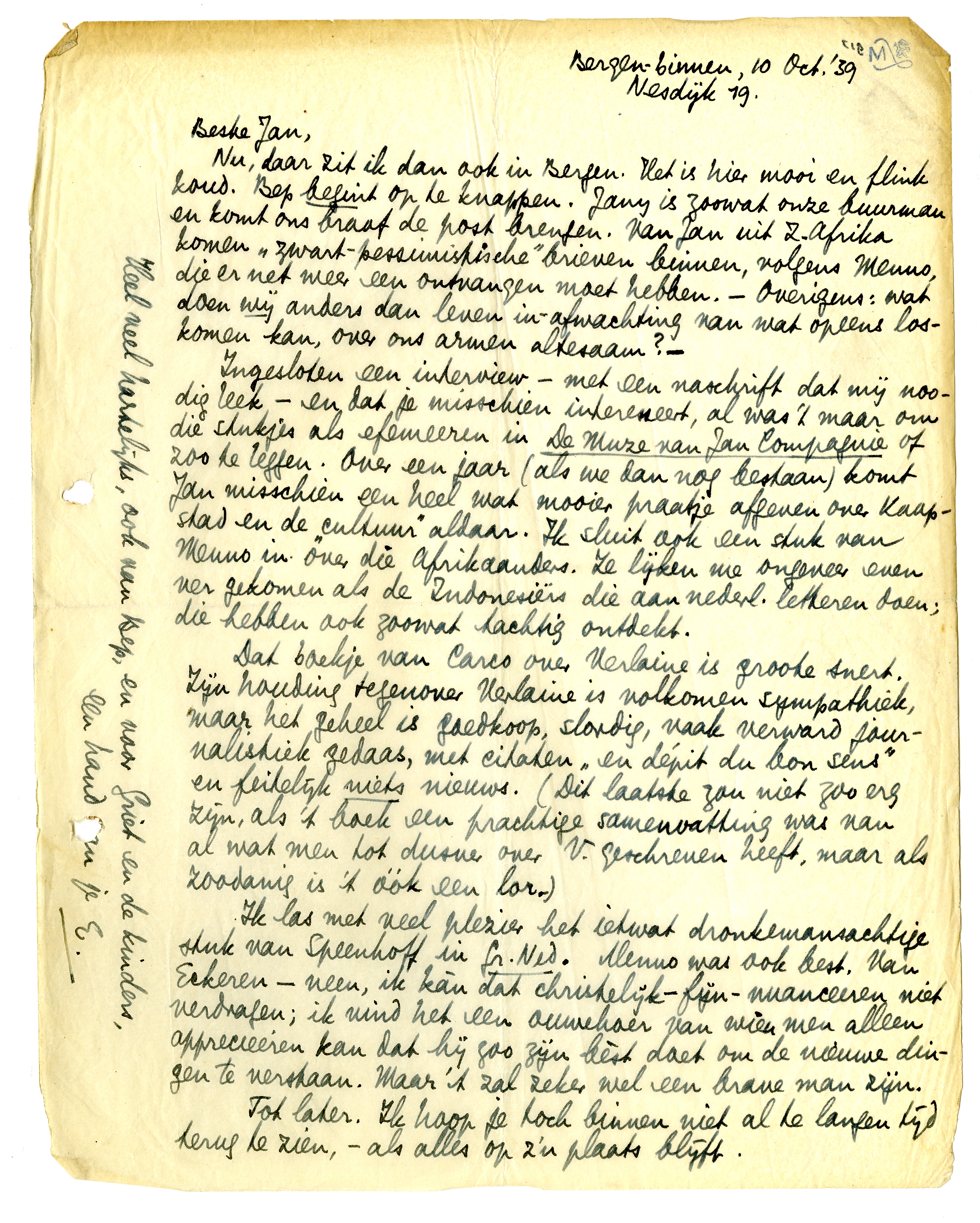 Nu, daar zit ik dan ook in Bergen. Het is hier mooi en flink koud. Bep begint op te knappen. Jany is zoowat onze buurman en komt ons braaf de post brengen. Van Jan uit Z. Afrika komen ‘zwart-pessimistische’ brieven binnen, volgens Menno, die er net weer een ontvangen moet hebben. - Overigens: wat doen wij anders dan leven inafwachting van wat opeens loskomen kan, over ons armen altesaam? -