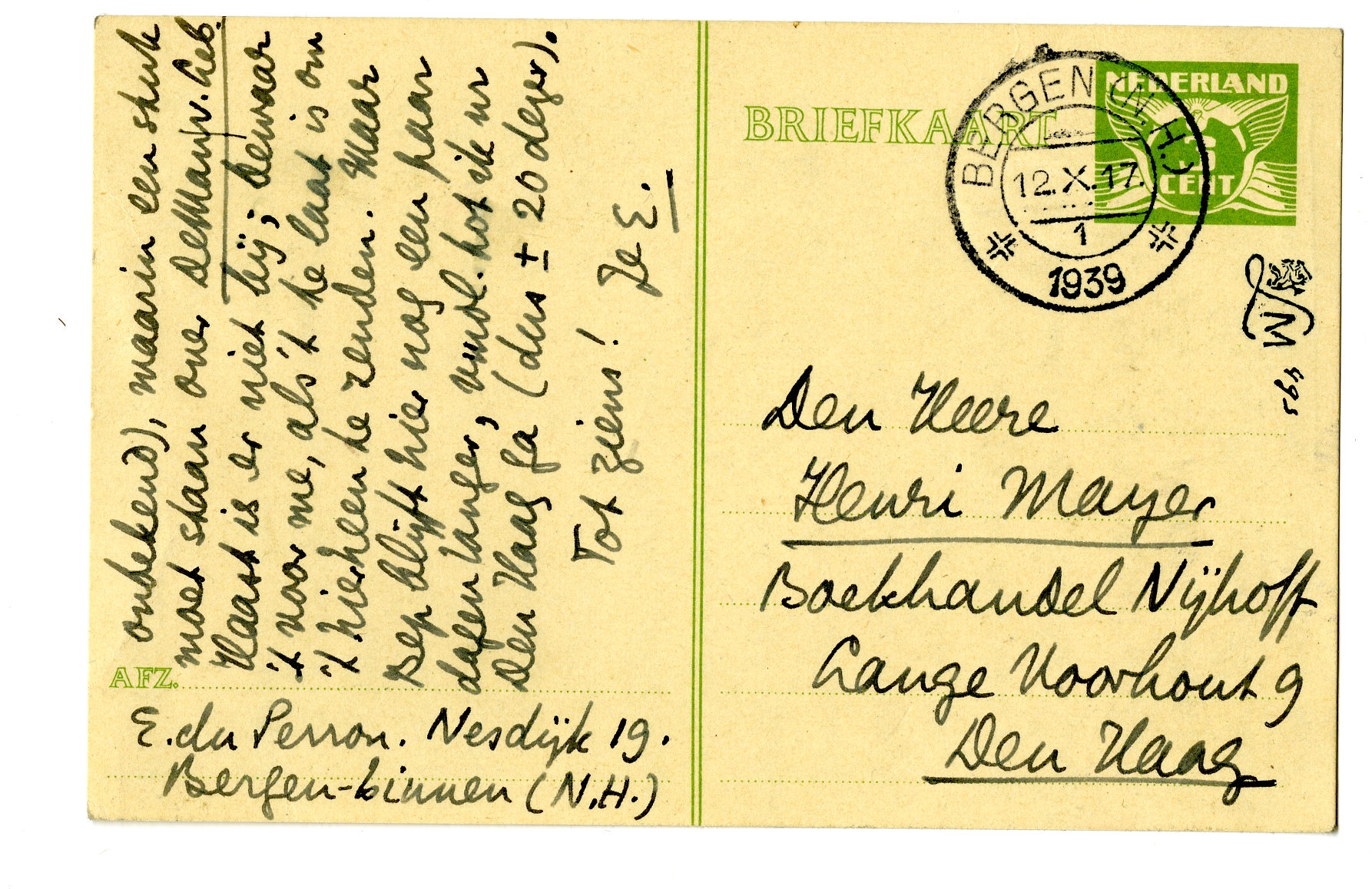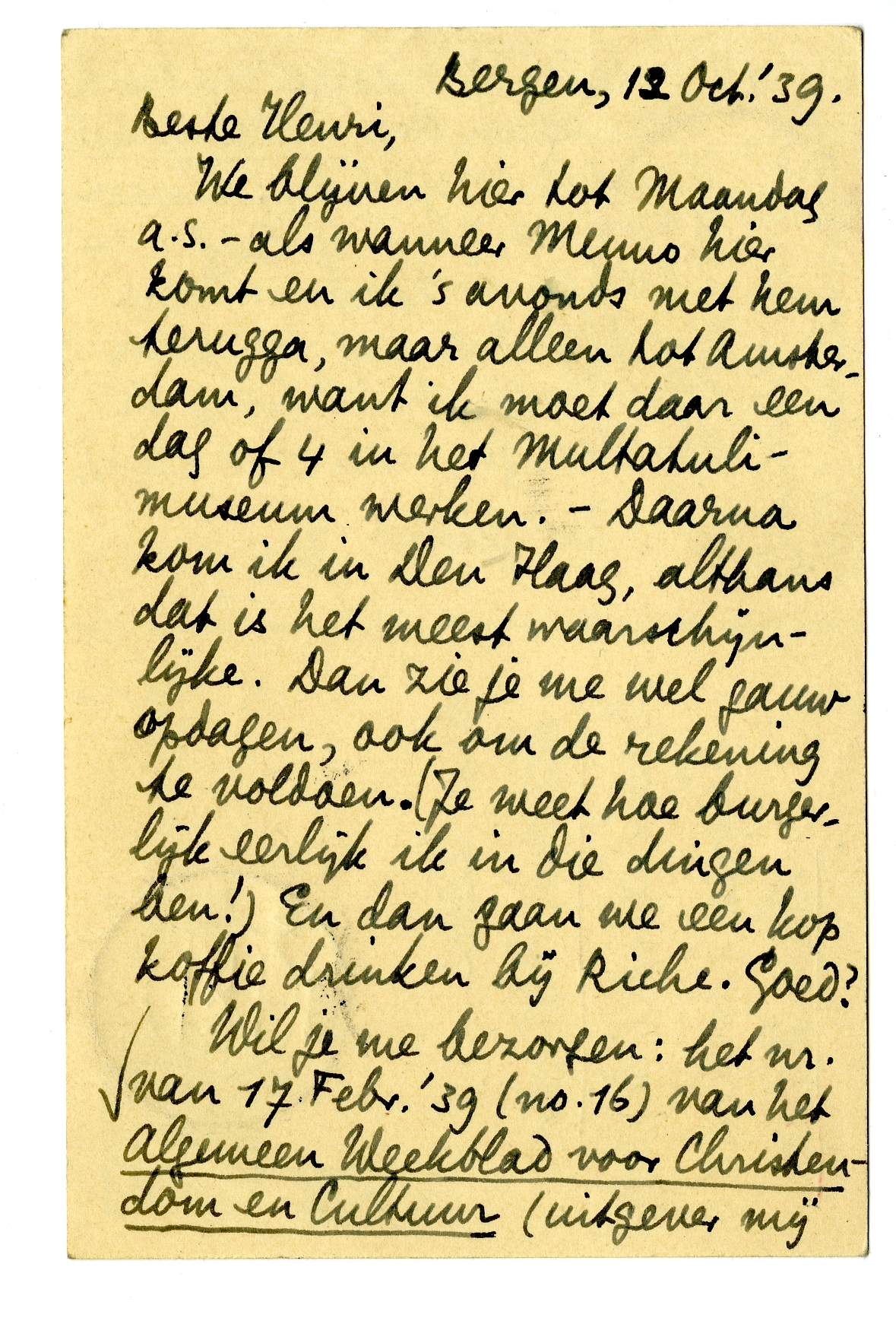 Wil je me bezorgen: het nr. van 17 Febr. '39 (no. 16) van het Algemeen Weekblad voor Christendom en Cultuur (uitgever mij onbekend), waarin een stuk moet staan over De Man v. Leb.6255 Haast is er niet bij; bewaar 't voor me, als 't te laat is om 't hierheen te zenden. Maar Bep blijft hier nog een paar dagen langer, vmdl. tot ik nr Den Haag ga (dus ± 20 dezer).
