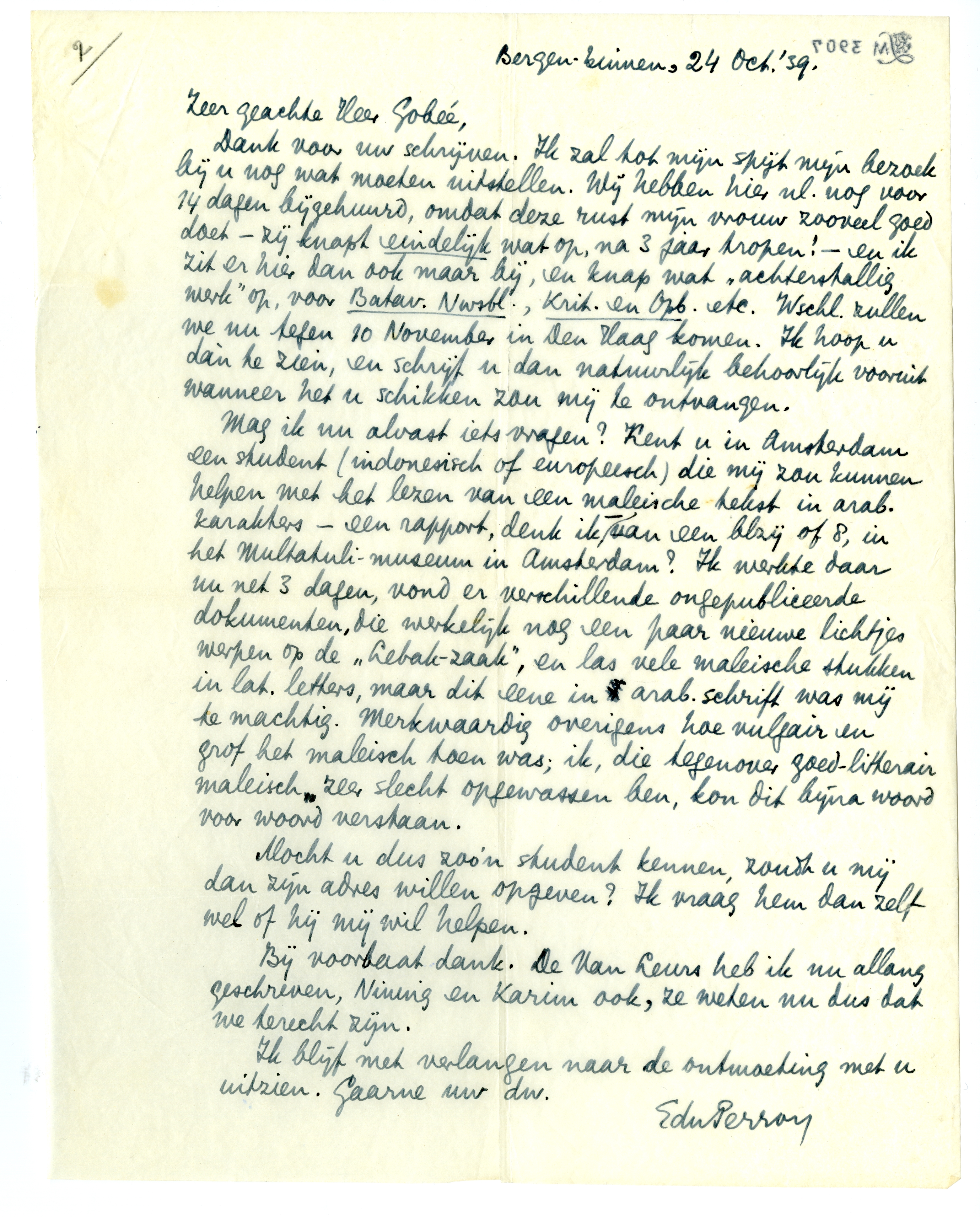 Mag ik nu alvast iets vragen? Kent u in Amsterdam een student (indonesisch of europeesch) die mij zou kunnen helpen met het lezen van een maleische tekst in arab. karakters - een rapport, denk ik - van een blzij of 8, in het Multatuli-museum in Amsterdam? Ik werkte daar nu net 3 dagen, vond er verschillende ongepubliceerde dokumenten, die werkelijk nog een paar nieuwe lichtjes werpen op de ‘Lebak-zaak’, en las vele maleische stukken in lat. letters, maar dit eene in arab. schrift was mij te machtig.6274 Merkwaardig overigens hoe vulgair en grof het maleisch toen was; ik, die tegenover goedlitterair maleisch zeer slecht opgewassen ben, kon dit bijna woord voor woord verstaan.