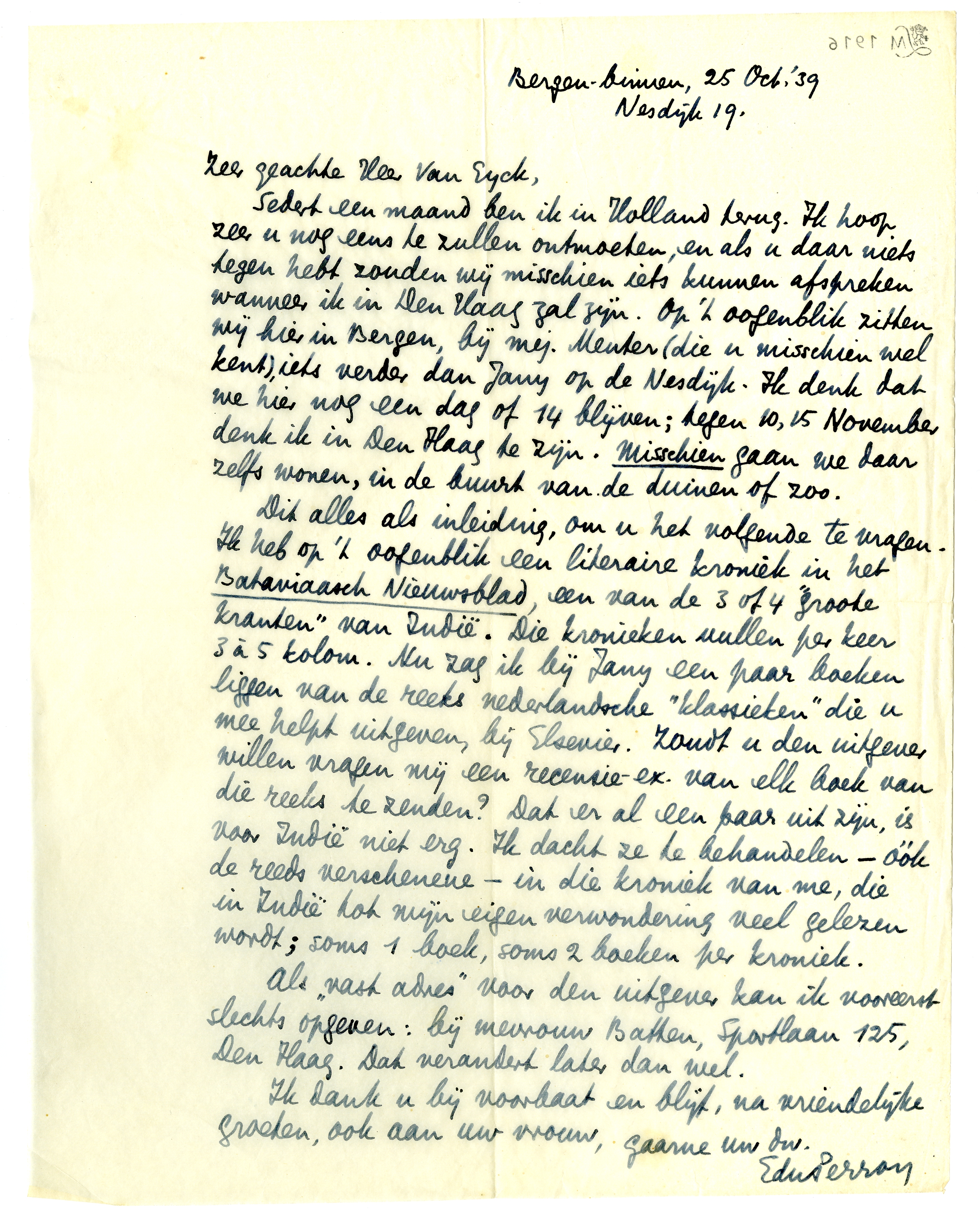 Dit alles als inleiding, om u het volgende te vragen. Ik heb op 't oogenblik een literaire kroniek in het Bataviaasch Nieuwsblad, een van de 3 of 4 ‘groote kranten’ van Indië. Die kronieken vullen per keer 3 à 5 kolom. Nu zag ik bij Jany een paar boeken liggen van de reeks nederlandsche ‘klassieken’ die u mee helpt uitgeven, bij Elsevier. Zoudt u den uitgever willen vragen mij een recensie-ex. van elk boek van die reeks te zenden? Dat er al een paar uit zijn, is voor Indië niet erg. Ik dacht ze te behandelen - óók de reeds verschenene - in die kroniek van me, die in Indië tot mijn eigen verwondering veel gelezen wordt; soms 1 boek, soms 2 boeken per kroniek.