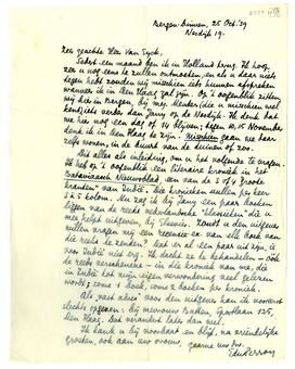 Sedert een maand ben ik in Holland terug. Ik hoop zeer u nog eens te zullen ontmoeten, en als u daar niets tegen hebt zouden wij misschien iets kunnen afspreken wanneer ik in Den Haag zal zijn. Op 't oogenblik zitten wij hier in Bergen, bij mej. Meuter (die u misschien wel kent), iets verder dan Jany op de Nesdijk. Ik denk dat we hier nog een dag of 14 blijven; tegen 10, 15 November denk ik in Den Haag te zijn. Misschien gaan we daar zelfs wonen, in de buurt van de duinen of zoo.