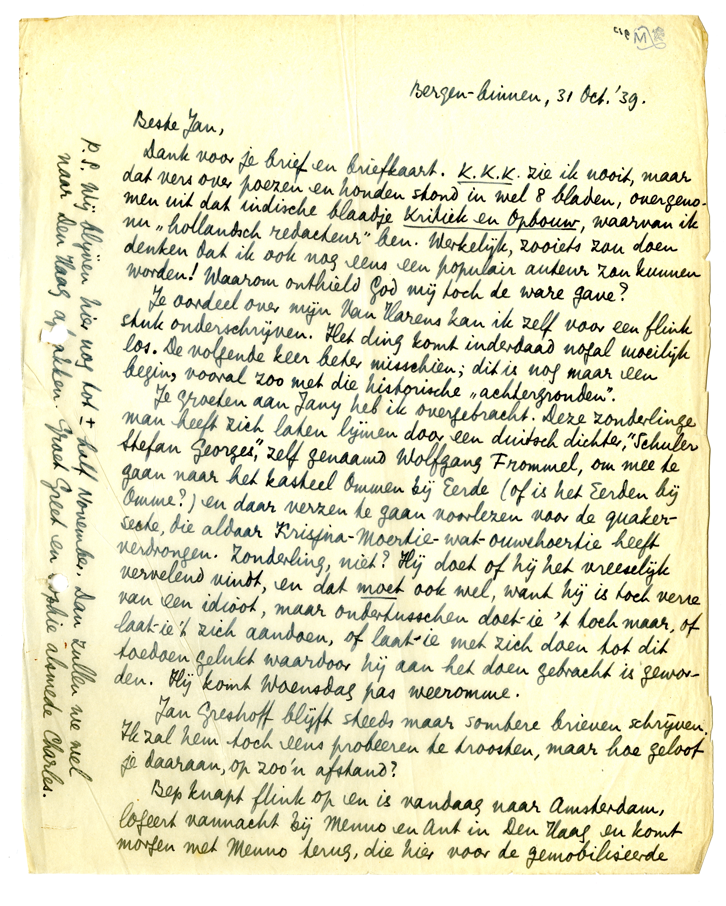 Dank voor je brief en briefkaart. K.K.K. zie ik nooit, maar dat vers over poezen en honden stond in wel 8 bladen, overgenomen uit dat indische blaadje Kritiek en Opbouw, waarvan ik nu ‘hollandsch redacteur’ ben. Werkelijk, zooiets zou doen denken dat ik ook nog eens een populair auteur zou kunnen worden! Waarom onthield God mij toch de ware gave?