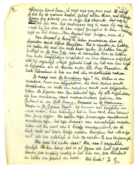Bep knapt flink op en is vandaag naar Amsterdam, logeert vannacht bij Menno en Ant in Den Haag en komt morgen met Menno terug, die hier voor de gemobiliseerde officieren komt lezen,6338 ik weet niet meer over wat. Ik schrijf je dit bij de warme kachel, geheel alleen thuis, met Alijntje boven mij alsnog, en in mijn bed slapende. Dat mag hij soms, als één van het ouderpaar weg is, maar hij mag dan - wat hij hier door de kou nogal geneigd is te doen - volstrekt niet in bed piesen. (Van Deyssel zegt: piessen, meen ik.)