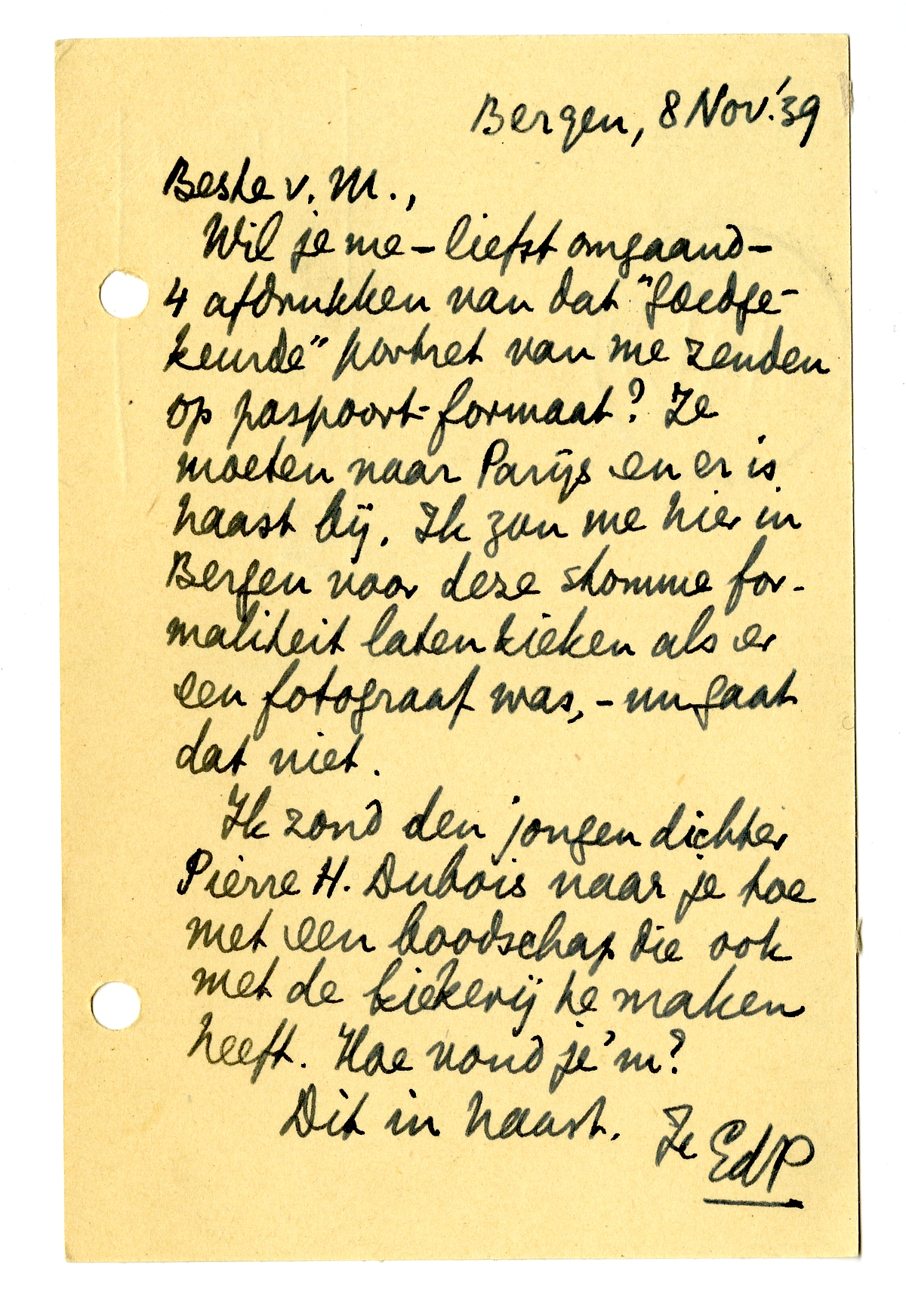 Wil je me - liefst omgaand - 4 afdrukken van dat ‘goedgekeurde’ portret van me zenden op paspoort-formaat? Ze moeten naar Parijs en er is haast bij. Ik zou me hier in Bergen voor deze stomme formaliteit laten kieken als er een fotograaf was, - nu gaat dat niet.
