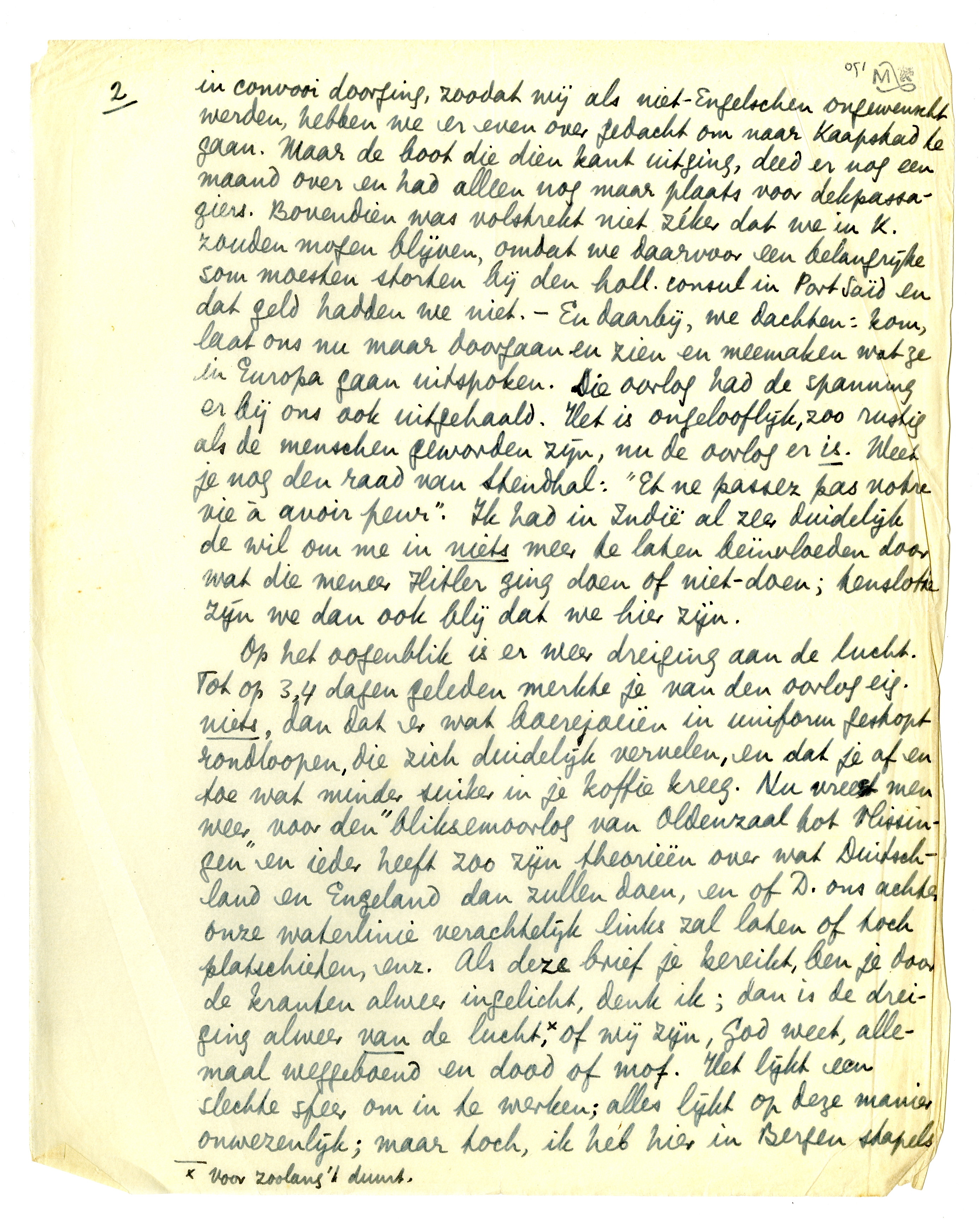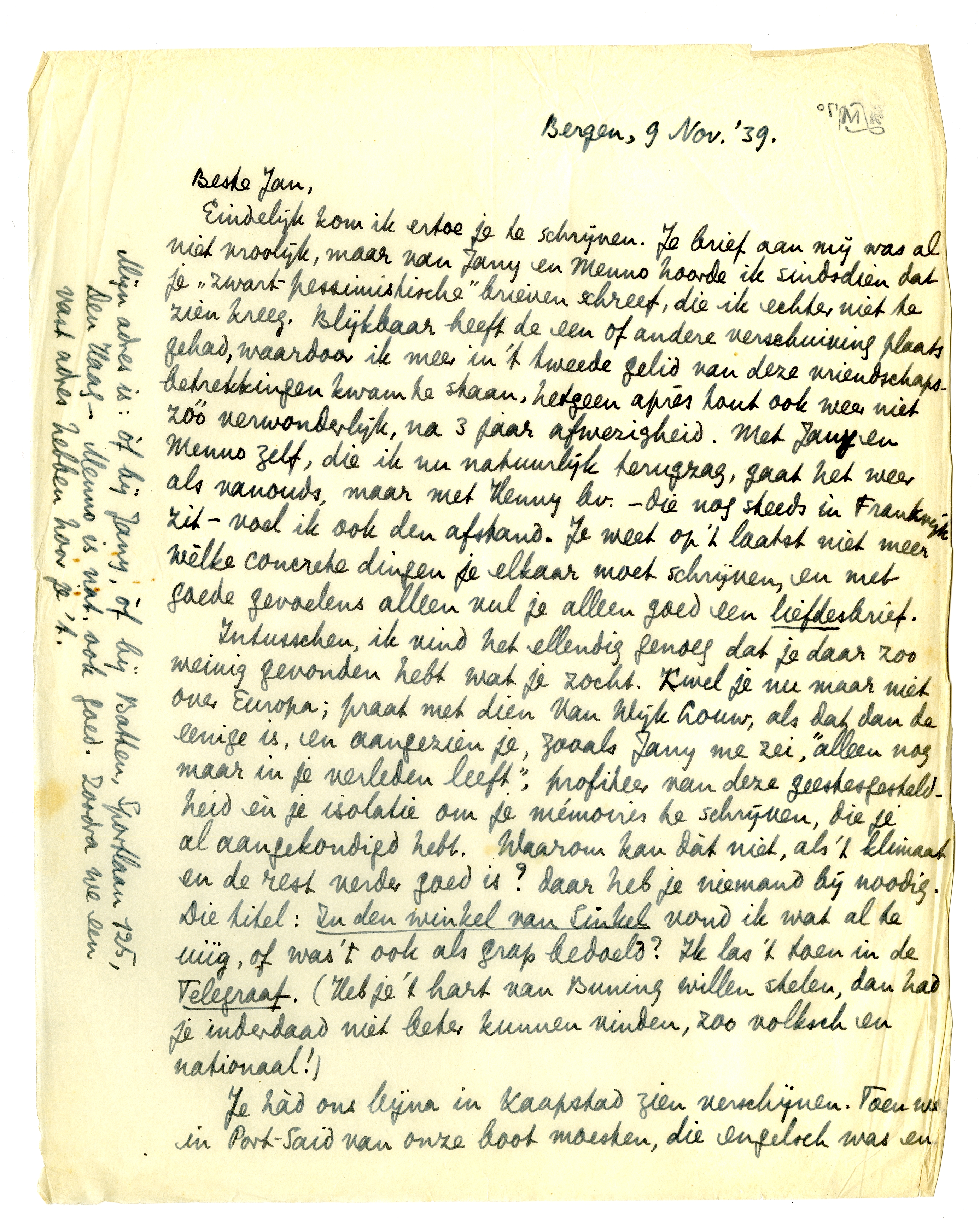 Op het oogenblik is er weer dreiging aan de lucht. Tot op 3, 4 dagen geleden merkte je van den oorlog eig. niets, dan dat er wat boerejoeïen in uniform gestopt rondloopen, die zich duidelijk vervelen, en dat je af en toe wat minder suiker in je koffie kreeg. Nu vreest men weer ‘voor den bliksemoorlog van Oldenzaal tot Vlissingen’ en ieder heeft zoo zijn theorieën over wat Duitschland en Engeland dan zullen doen, en of D. ons achter onze waterlinie verachtelijk links zal laten of toch platschieten, enz. Als deze brief je bereikt, ben je door de kranten alweer ingelicht, denk ik; dan is de dreiging alweer van de lucht,* of wij zijn, God weet, allemaal weggeboend en dood of mof. Het lijkt een slechte sfeer om in te werken; alles lijkt op deze manier onwezenlijk; maar toch, ik heb hier in Bergen stapels artikelen voor 't Bataviaasch Nieuwsblad en voor Kritiek en Opbouw gepend (om weer wat geld in 't laadje te brengen, wat nr 1 betreft) en vanavond gaan we - voor Bep en mij voor de éérste keer sinds we Europa weer betraden - met Jany in Alkmaar naar de bioskoop.6364