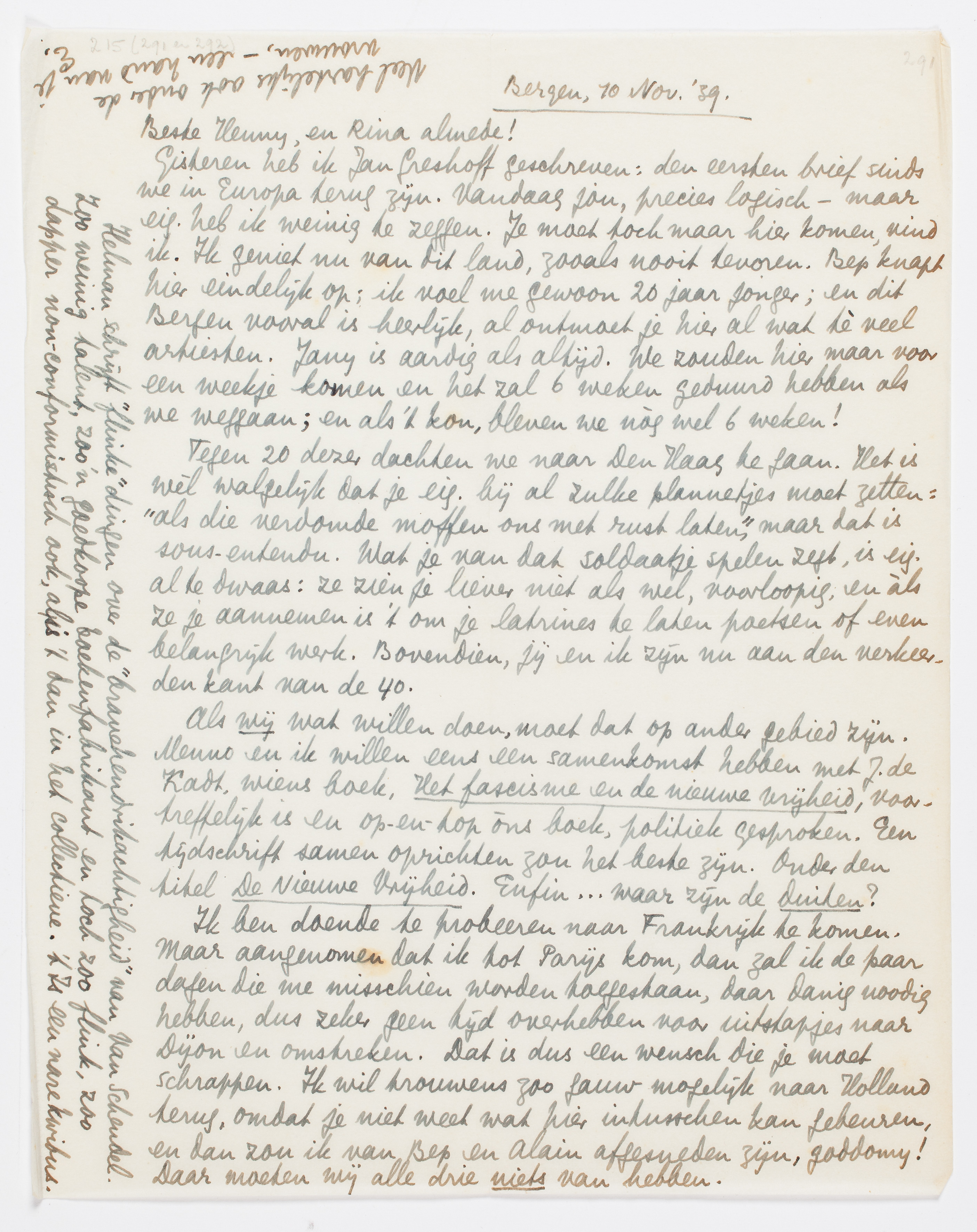 Als je hier komt, laten we dan niet ver van elkaar ‘buiten’ wonen; hier bijv. Tenzij ik in Den Haag moèt blijven. Als alles goed gaat, dacht ik daar vanaf 20 dezer 1½ maand of 2 maanden te blijven voor die Van Hogendorp-papieren, daarna weer hier terug te komen of elders ‘buiten’ neer te strijken. Maar 't kàn zijn dat mijn eigen werk me dwingt om in de stad te blijven. Is Haarlem niks? Of Vogelenzang of Bennebroek? Daar zijn wel minder artiesten.