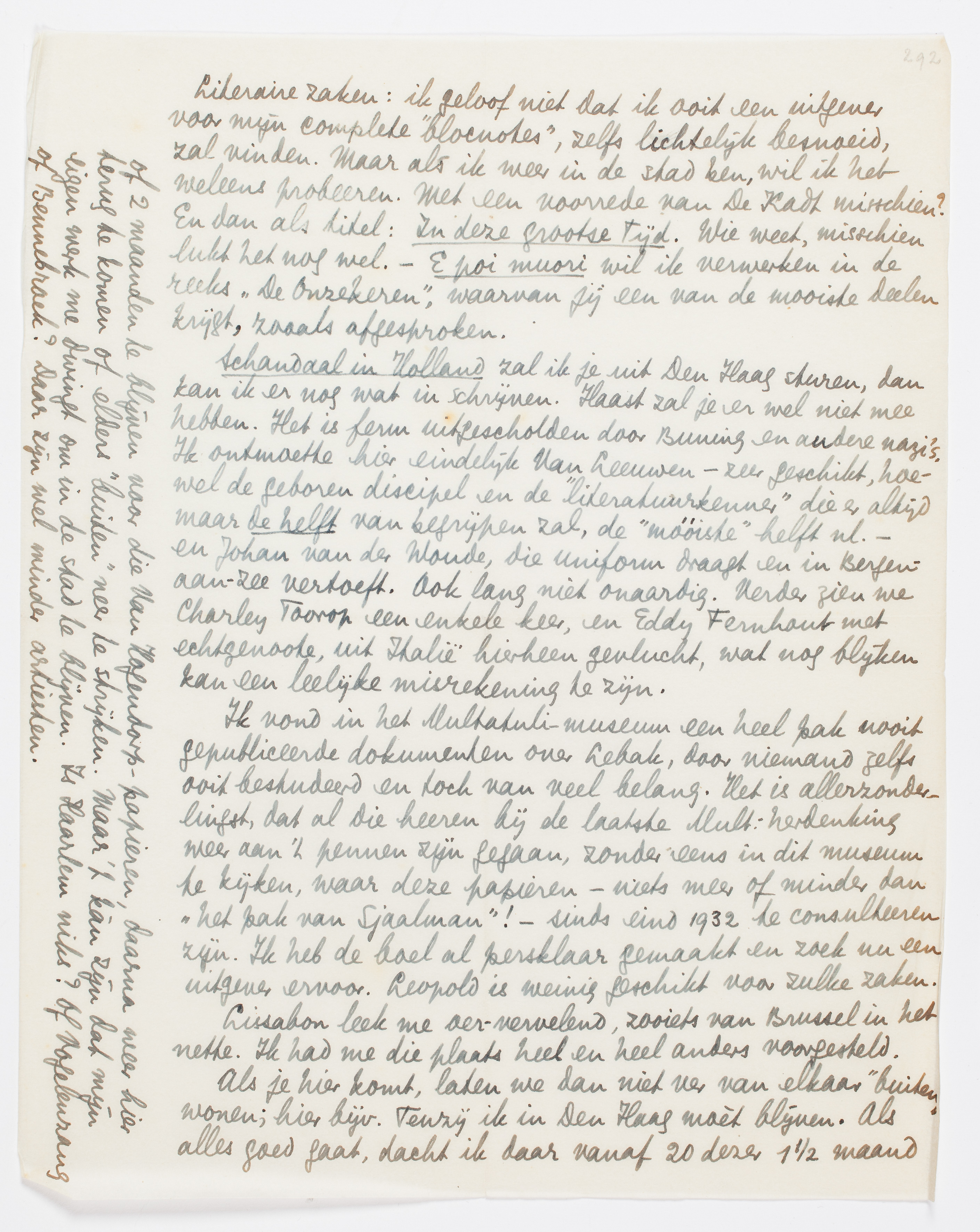 Ik vond in het Multatuli-museum een heel pak nooit gepubliceerde dokumenten over Lebak, door niemand zelfs ooit bestudeerd en toch van veel belang. Het is allerzonderlingst, dat al die heeren bij de laatste Mult.-herdenking weer aan 't pennen zijn gegaan, zonder eens in dit museum te kijken, waar deze papieren - niets meer of minder dan ‘het pak van Sjaalman’! - sinds eind 1932 te consulteeren zijn. Ik heb de boel al persklaar gemaakt en zoek nu een uitgever ervoor. Leopold is weinig geschikt voor zulke zaken.