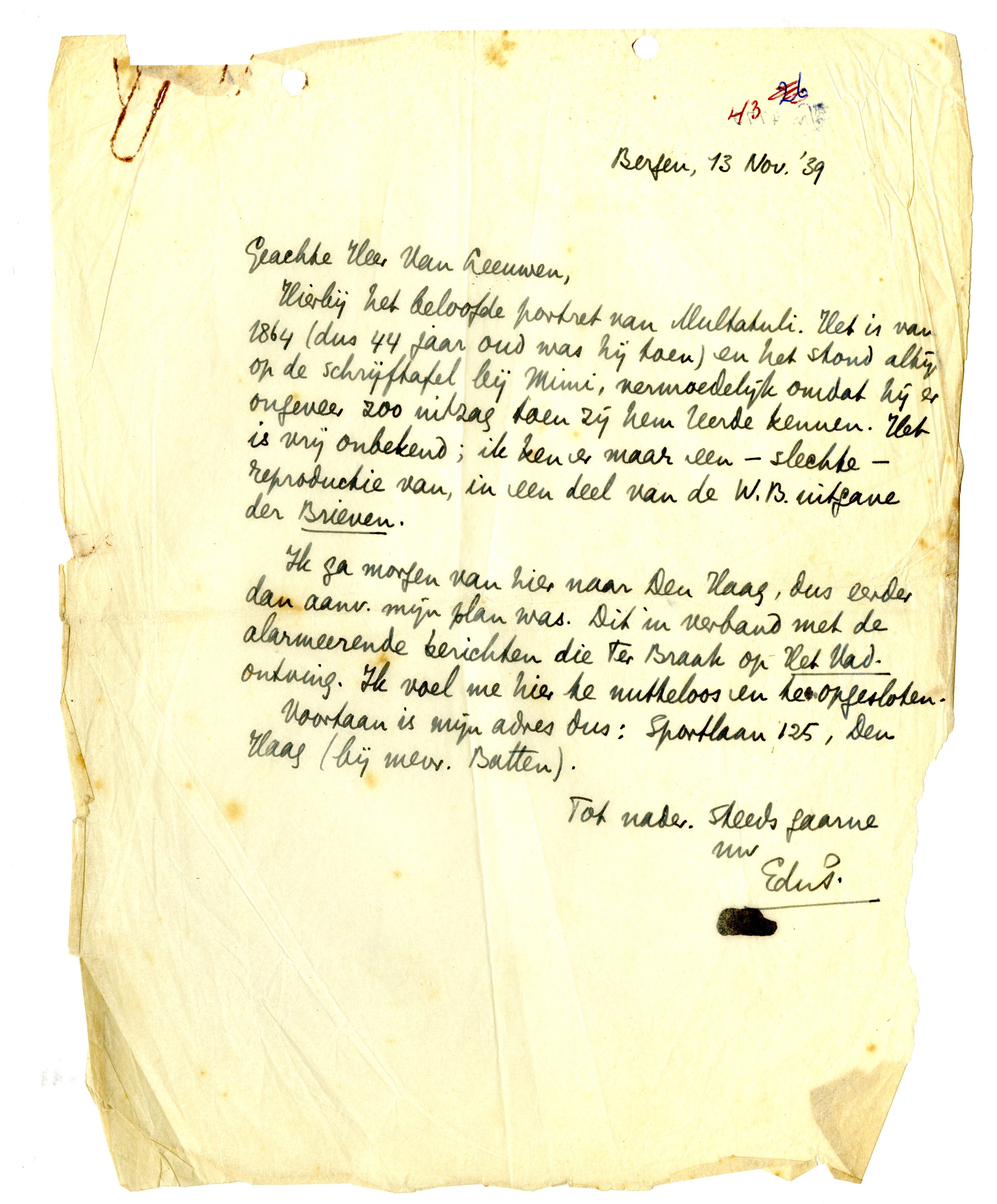 Ik ga morgen van hier naar Den Haag, dus eerder dan aanv. mijn plan was. Dit in verband met de alarmeerende berichten die Ter Braak op Het Vad. ontving. Ik voel me hier te nutteloos en te opgesloten.