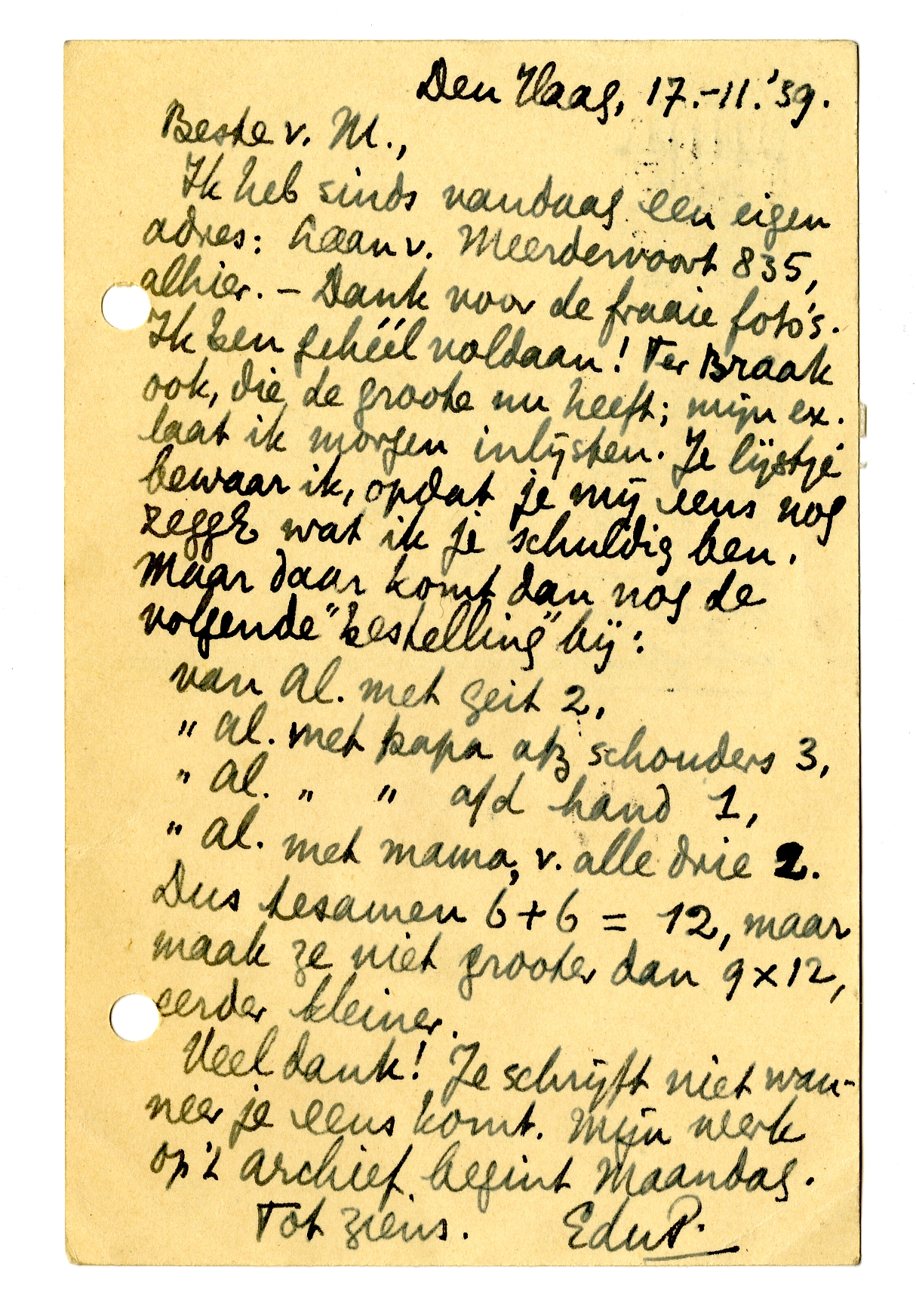 Ik heb sinds vandaag een eigen adres: Laan v. Meerdervoort 835, alhier. - Dank voor de fraaie foto's. Ik ben gehéél voldaan! Ter Braak ook, die de groote nu heeft; mijn ex. laat ik morgen inlijsten. Je lijstje bewaar ik, opdat je mij eens nog zegge wat ik je schuldig ben. Maar daar komt dan nog de volgende ‘bestelling’ bij:
