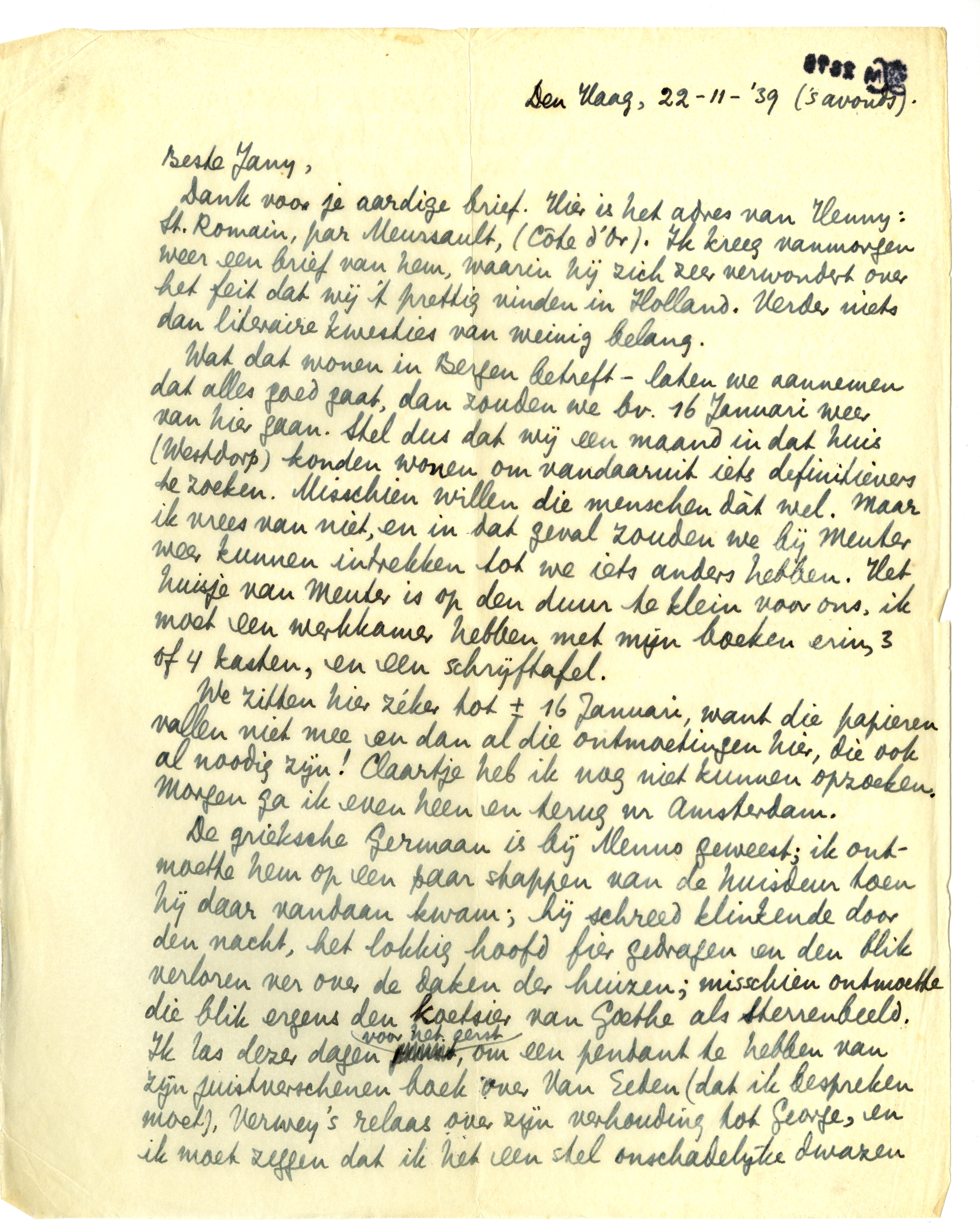 Dank voor je aardige brief. Hier is het adres van Henny: St. Romain, par Meursault, (Côte d'Or). Ik kreeg vanmorgen weer een brief van hem, waarin hij zich zeer verwondert over het feit dat wij 't prettig vinden in Holland. Verder niets dan literaire kwesties van weinig belang.
