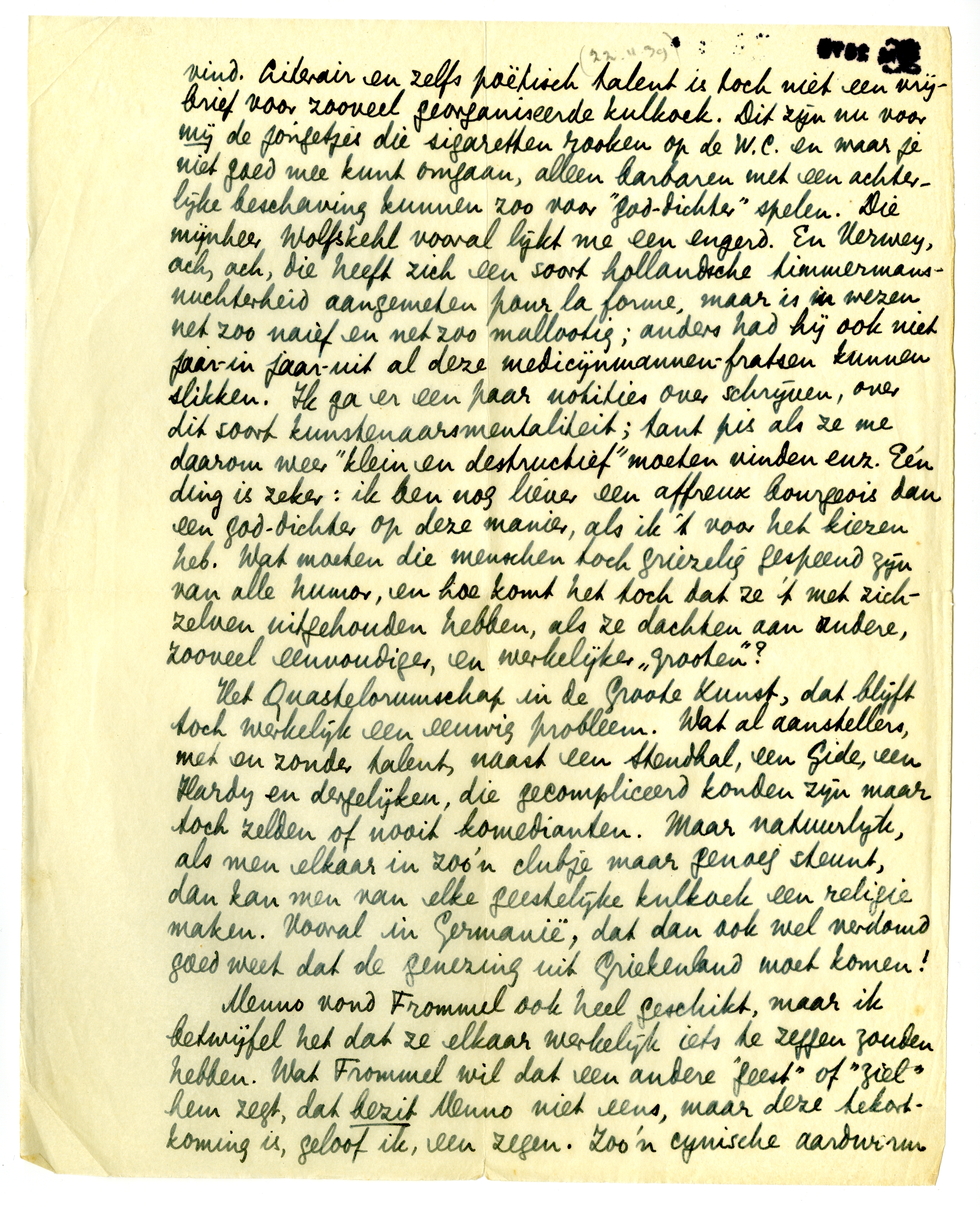 Het Quastelorumschap in de Groote Kunst, dat blijft toch werkelijk een eeuwig probleem. Wat al aanstellers, met en zonder talent, naast een Stendhal, een Gide, een Hardy en dergelijken, die gecompliceerd konden zijn maar toch zelden of nooit komedianten. Maar natuurlijk, als men elkaar in zoo'n clubje maar genoeg steunt, dan kan men van elke geestelijke kulkoek een religie maken. Vooral in Germanië, dat dan ook wel verdomd goed weet dat de genezing uit Griekenland moet komen!