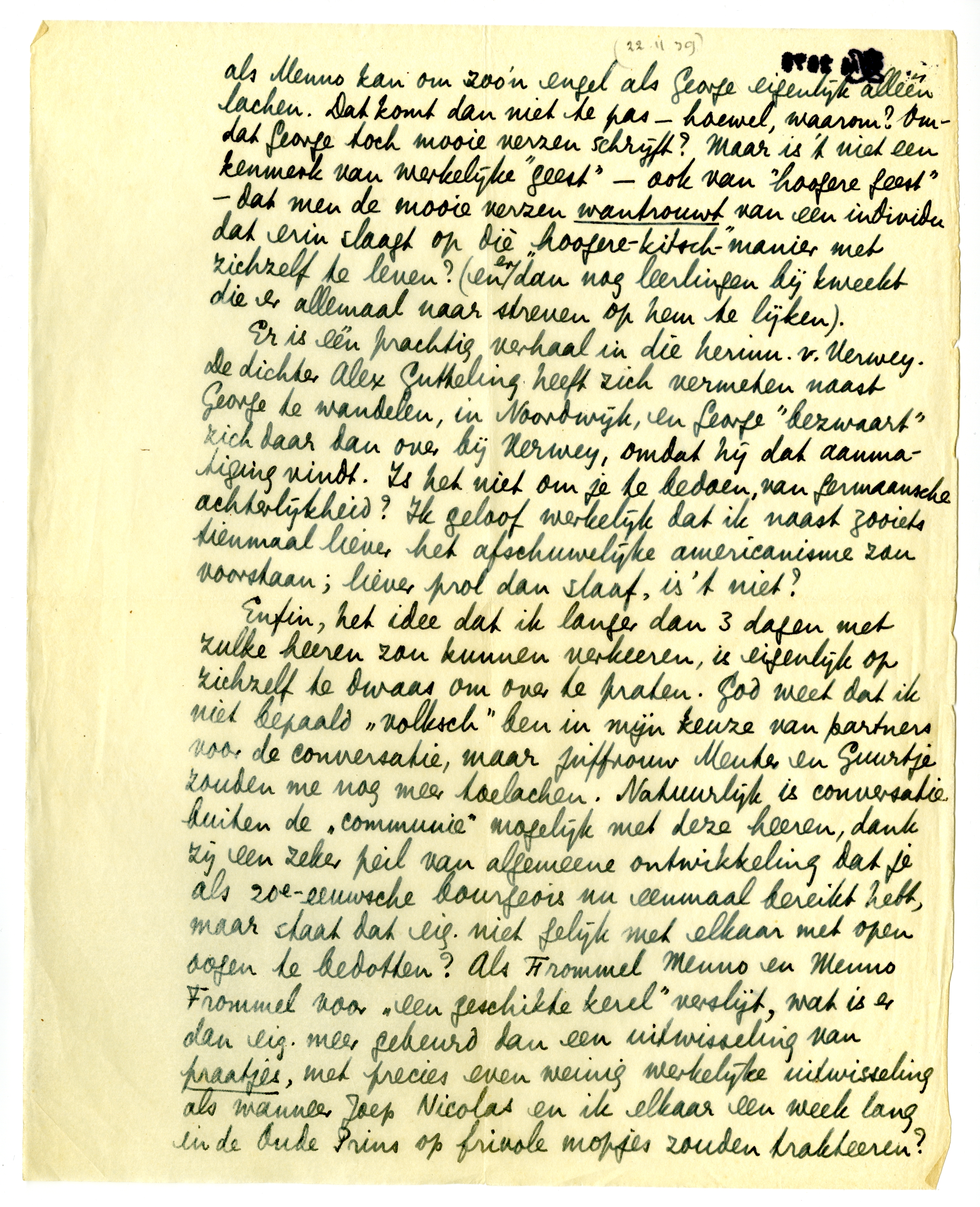 Menno vond Frommel ook heel geschikt, maar ik betwijfel het dat ze elkaar werkelijk iets te zeggen zouden hebben. Wat Frommel wil dat een andere ‘geest’ of ‘ziel’ hem zegt, dat bezit Menno niet eens, maar deze tekortkoming is, geloof ik, een zegen. Zoo'n cynische aardworm als Menno kan om zoo'n engel als George eigenlijk alleen lachen. Dat komt dan niet te pas - hoewel, waarom? Omdat George toch mooie verzen schrijft? Maar is 't niet een kenmerk van werkelijke ‘geest’ - ook van ‘hoogere geest’ - dat men de mooie verzen wantrouwt van een individu dat erin slaagt op diè ‘hoogere-kitsch’-manier met zichzelf te leven? (en er dan nog leerlingen bij kweekt die er allemaal naar streven op hem te lijken).