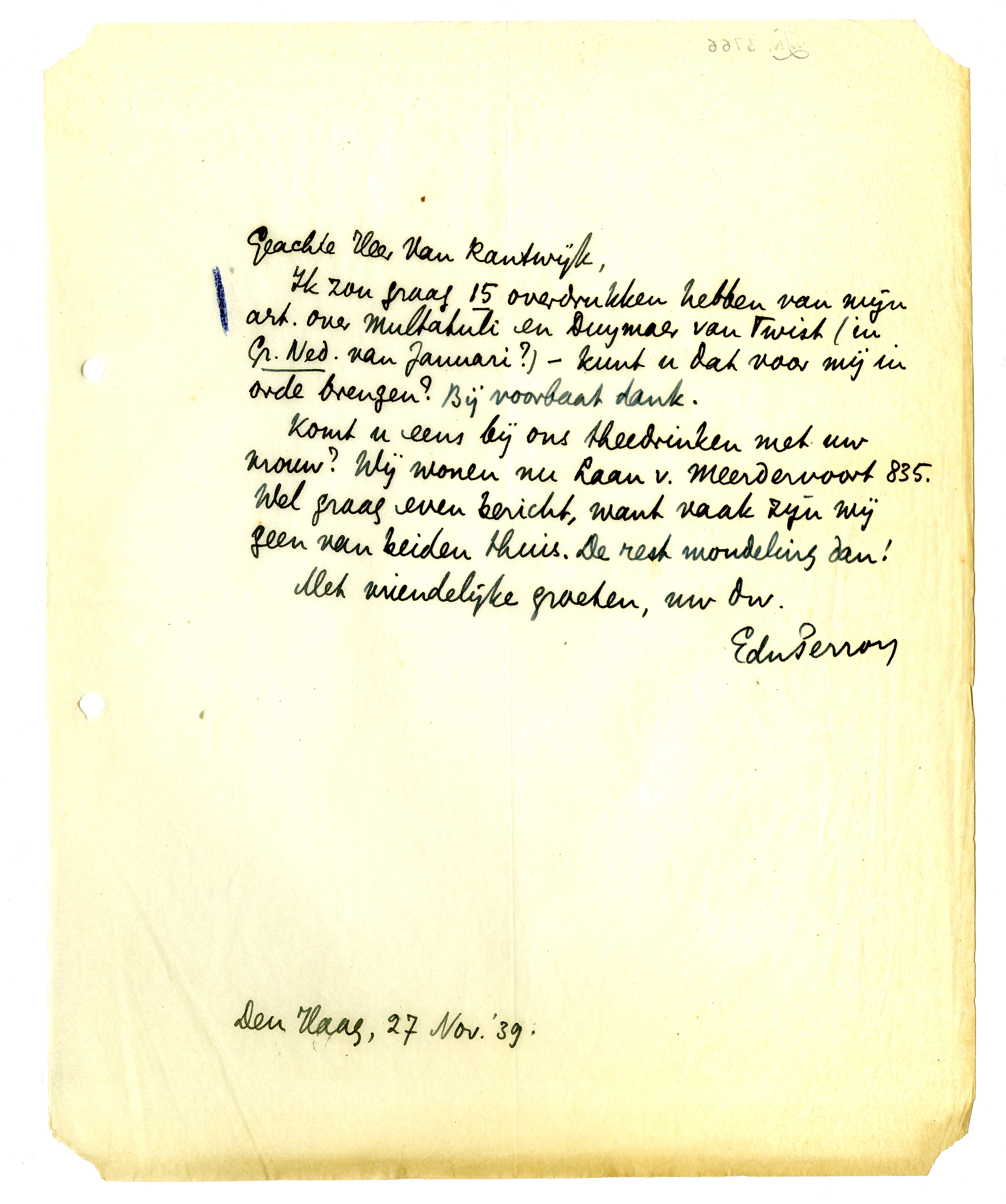 Komt u eens bij ons theedrinken met uw vrouw? Wij wonen nu Laan v. Meerdervoort 835. Wel graag even bericht, want vaak zijn wij geen van beiden thuis. De rest mondeling dan!