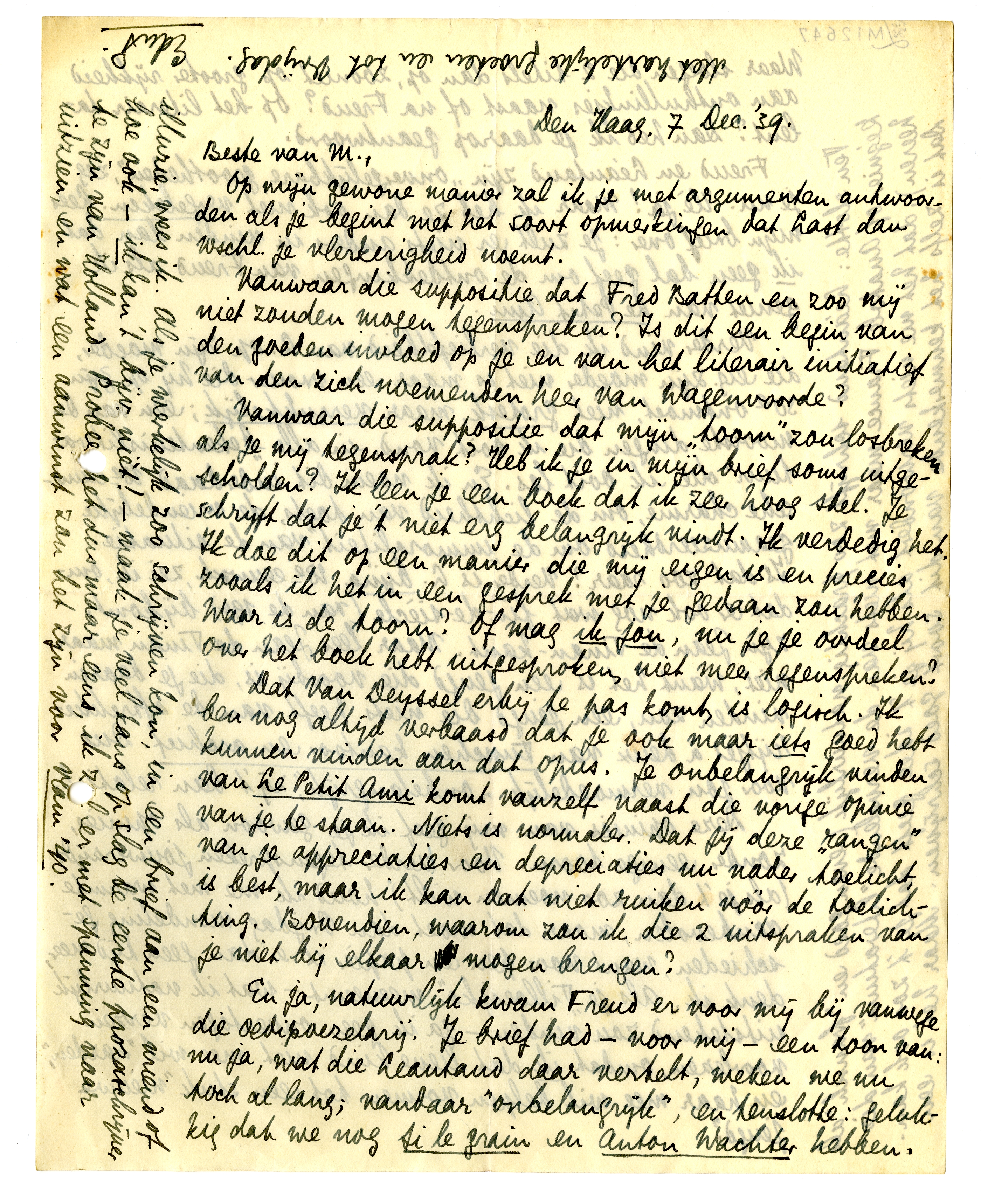 En ja, natuurlijk kwam Freud er voor mij bij vanwege die oedipoezelarij. Je brief had - voor mij - een toon van: nu ja, wat die Leautaud daar vertelt, weten we nu toch al lang; vandaar ‘onbelangrijk’, en tenslotte: gelukkig dat we nog Si le grain en Anton Wachter hebben. Waar sloegen die 2 titels dan op, zooniet op grooter rijkheid aan onthullinkjes naast of na Freud? Op het literair talent? Dan hèb ik je daarop geantwoord.