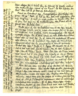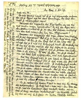 Vanwaar die suppositie dat mijn ‘toorn’ zou losbreken als je mij tegensprak? Heb ik je in mijn brief soms uitgescholden? Ik leen je een boek dat ik zeer hoog stel. Je schrijft dat je 't niet erg belangrijk vindt. Ik verdedig het. Ik doe dit op een manier die mij eigen is en precies zooals ik het in een gesprek met je gedaan zou hebben. Waar is de toorn? Of mag ik jou, nu je je oordeel over het boek hebt uitgesproken, niet meer tegenspreken?