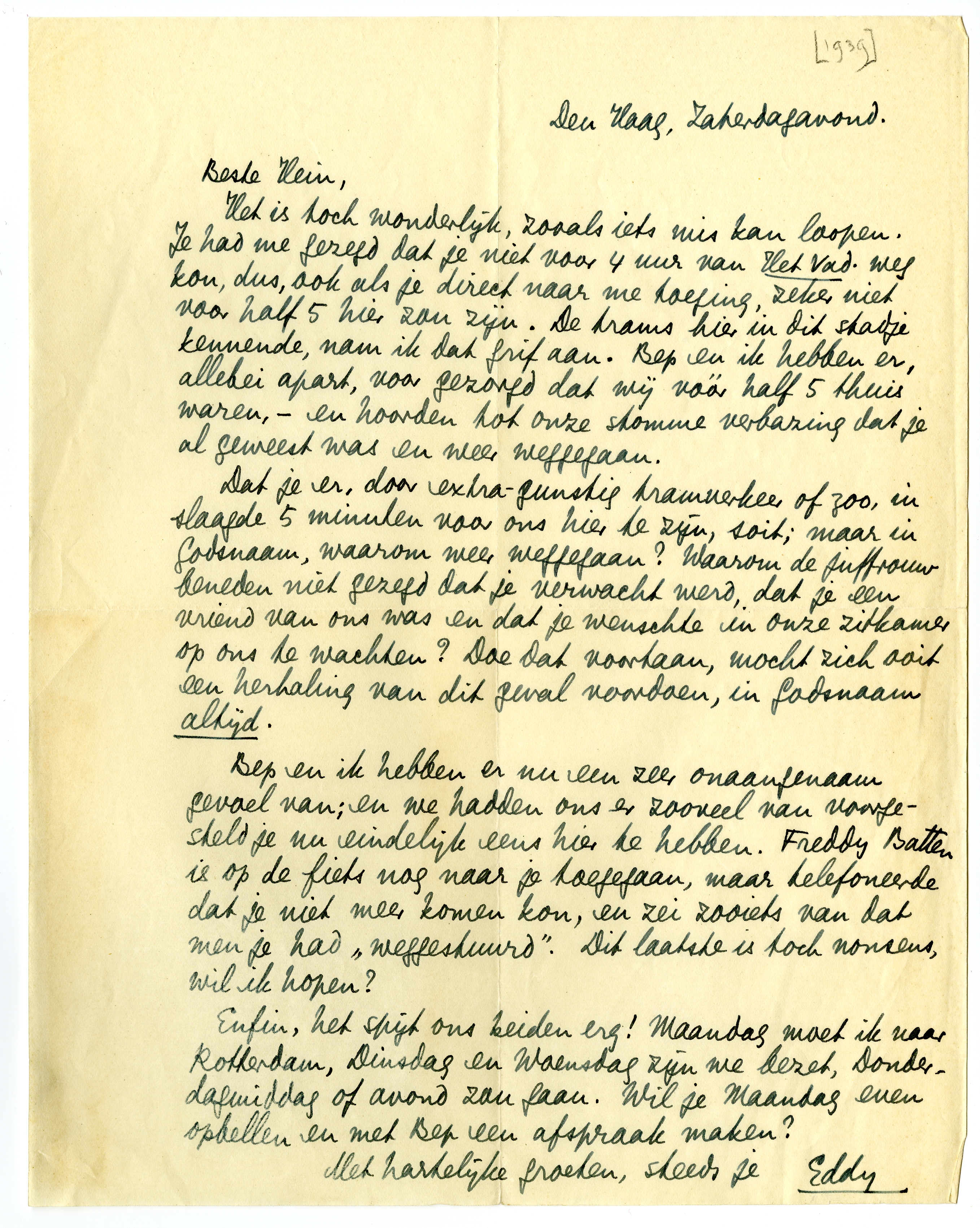 Het is toch wonderlijk, zooals iets mis kan loopen. Je had me gezegd dat je niet voor 4 uur van Het Vad.6472 weg kon, dus, ook als je direct naar me toeging, zeker niet voor half 5 hier6473 zou zijn. De trams hier in dit stadje kennende, nam ik dat grif aan. Bep en ik hebben er, allebei apart, voor gezorgd dat wij vóór half vijf thuis waren, - en hoorden tot onze stomme verbazing dat je al geweest was en weer weggegaan.