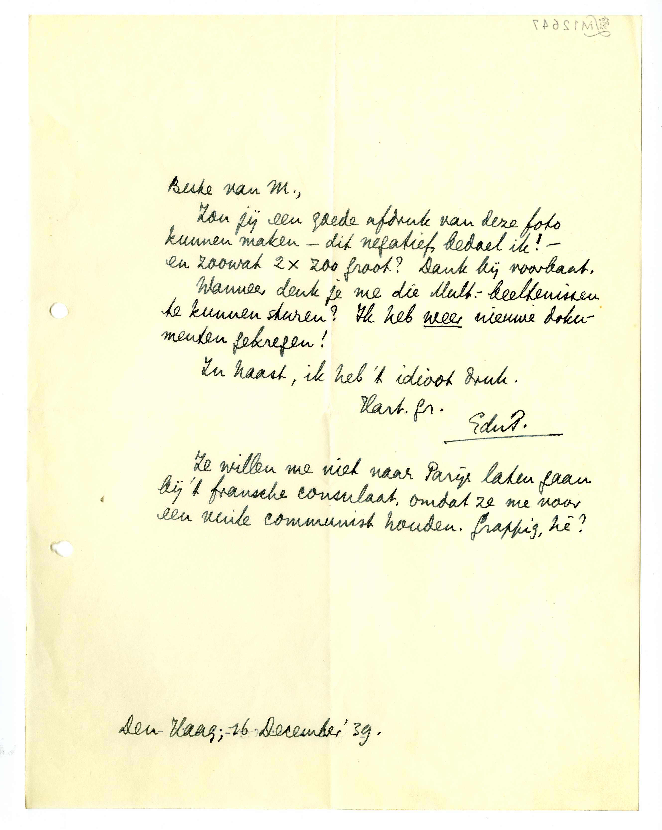 Ze willen me niet naar Parijs laten gaan bij 't fransche consulaat, omdat ze me voor een vuile communist houden. Grappig, hè?