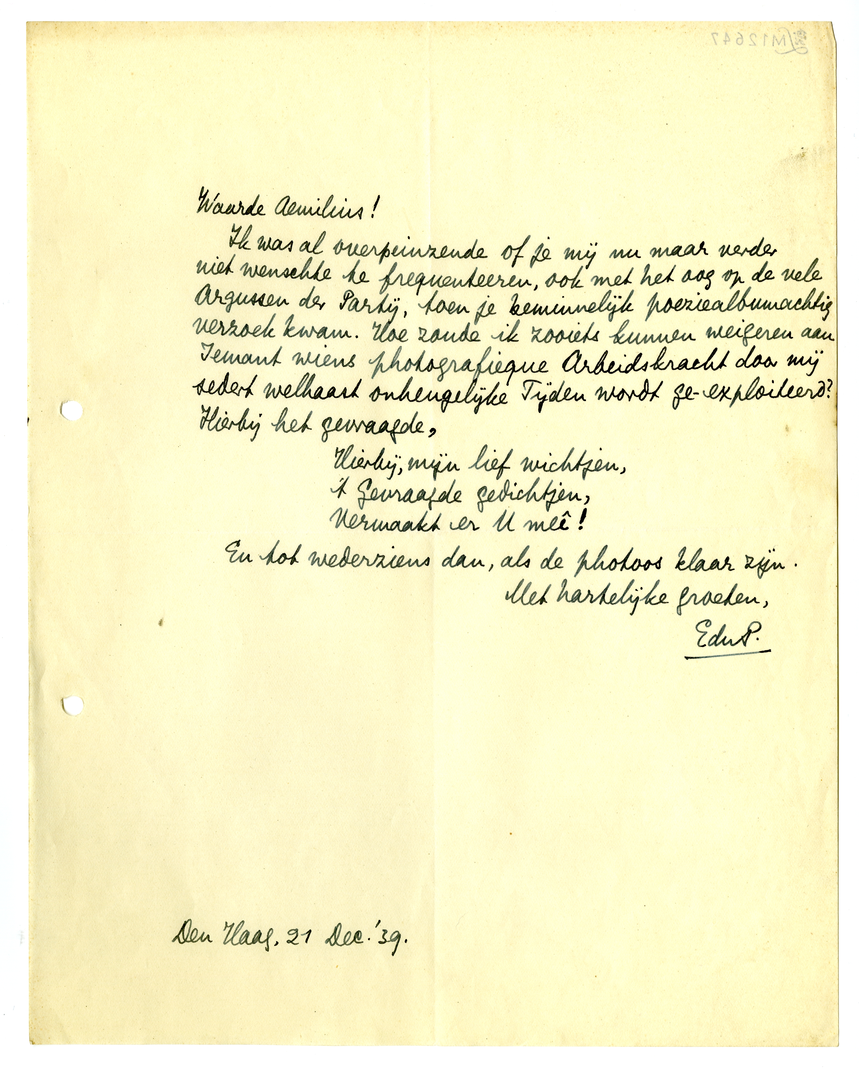 Ik was al overpeinzende of je mij nu maar verder niet wenschte te frequenteeren, ook met het oog op de vele Argussen der Partij, toen je beminnelijk poeziealbumachtig verzoek kwam. Hoe zoude ik zooiets kunnen weigeren aan Iemant wiens photografieque Arbeidskracht door mij sedert welhaast onheugelijke tijden wordt ge-exploiteerd? Hierbij het gevraagde,