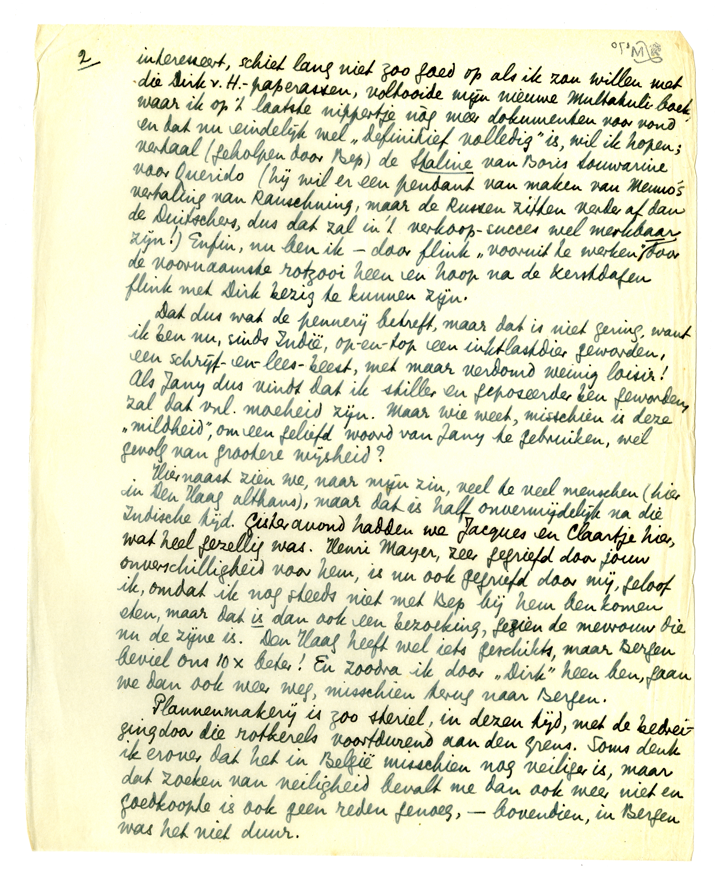 Hiernaast zien we, naar mijn zin, veel te veel menschen (hier in Den Haag althans), maar dat is half onvermijdelijk na die Indische tijd. Gisteravond hadden we Jacques en Claartje hier, wat heel gezellig was. Henri Mayer, zeer gegriefd door jouw onverschilligheid voor hem, is nu ook gegriefd door mij, geloof ik, omdat ik nog steeds niet met Bep bij hem ben komen eten, maar dat is dan ook een bezoeking, gezien de mevrouw die nu de zijne is. Den Haag heeft wel iets geschikts, maar Bergen beviel ons 10 × beter! En zoodra ik door ‘Dirk’ heen ben, gaan we dan ook weer weg, misschien terug naar Bergen.