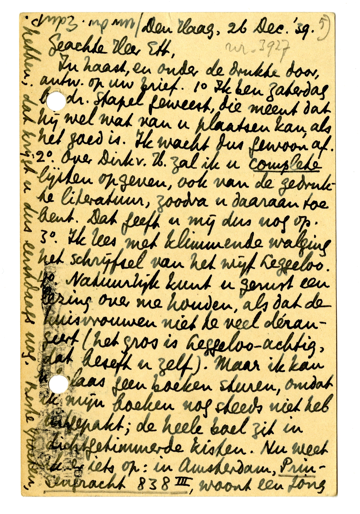 In haast, en onder de drukte door, antw. op uw brief 1o Ik ben Zaterdag bij dr. Stapel geweest, die meent dat hij wel wat van u plaatsen kan, als het goed is. Ik wacht dus gewoon af. 2o. Over Dirk v.H. zal ik u complete lijsten opgeven, ook van de gedrukte literatuur, zoodra u daaraan toe bent. Dat geeft u mij dus nog op. 3o. Ik lees met klimmende walging het schrijfsel van het wijf Leggeloo. 4o. Natuurlijk kunt u gerust een lezing6541 over me houden, als dat de huisvrouwen niet te veel dérangeert (het gros is Leggeloo-achtig, dat beseft u zelf). Maar ik kan helaas geen boeken sturen, omdat ik mijn boeken nog steeds niet heb uitgepakt; de heele boel zit in dichtgetimmerde kisten. Nu weet ik er iets op: in Amsterdam, Prinsengracht 838III, woont een jong dichter, Pierre H. Dubois, die zich juist bezig houdt met een ‘studie’ over me en die vmdl. ongeveer alles van me bezit. Gaat u eens met hem praten, hij kan u alle aanwijzingen geven, denk ik, en misschien ook wel voor een tijdje de noodige boeken afstaan. U zou hem kunnen schrijven en deze briefk. insluiten ‘ter recommandatie’. Voor 't gevraagde lijstje met data moet ik iets meer tijd hebben; dat krijgt u dus eerstdaags nog. Beste groeten, uw dw.