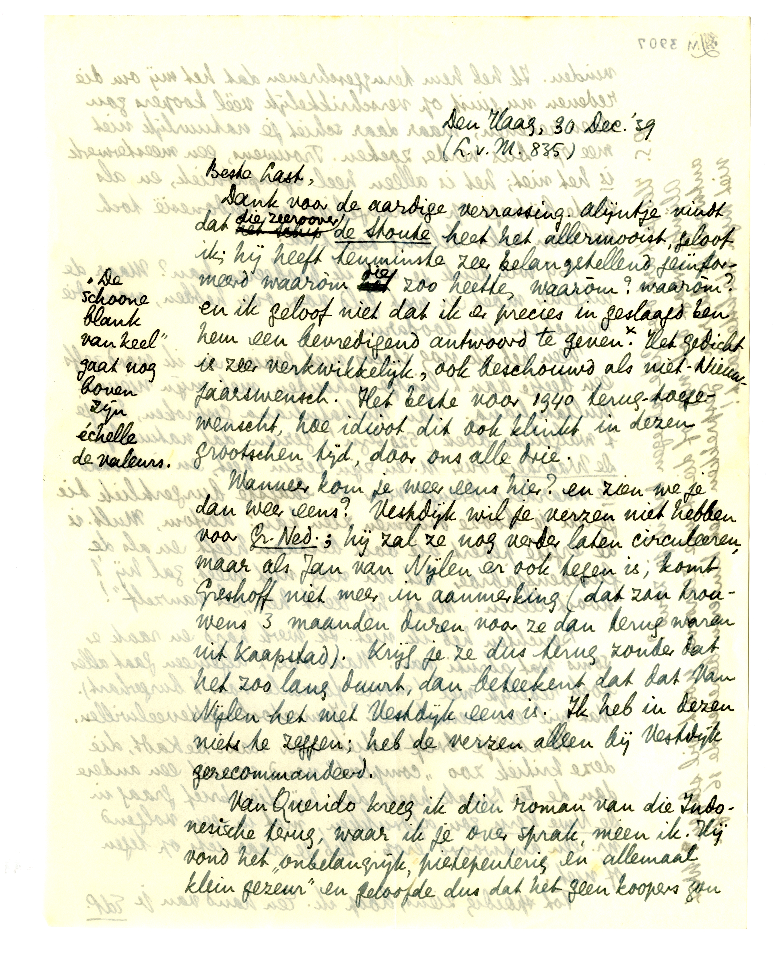 Dank voor de aardige verrassing. Alijntje vindt dat die zeeroover de Stoute heet het allermooist, geloof ik; hij heeft tenminste zeer belangstellend geïnformeerd waaròm die zoo heette, waaròm? waaròm? en ik geloof niet dat ik er precies in geslaagd ben hem een bevredigend antwoord te geven.* Het gedicht6561 is zeer verkwikkelijk, ook beschouwd als niet-Nieuwjaarswensch. Het beste voor 1940 terug-toegewenscht, hoe idioot dit ook klinkt in dezen grootschen tijd, door ons alle drie.