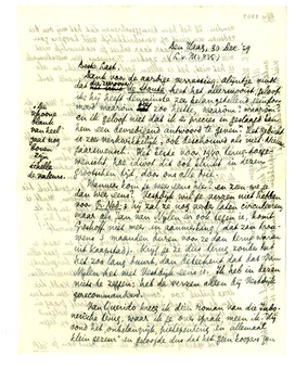 Veen heb ik nog steeds niet gezien en ik word zelfs een beetje aan 't lijntje gehouden met mijn nieuwe Multatuliana. Van Multatuliana gesproken, heb je 't walgelijke boek (520 blzn!) gezien, dat natuurlijk De Waarheid over M. en zijn gezin heet, en inderdaad de waarheid brengt voor de laagste burgerkliek die je in je booze droomen zien kan? Kortom, Mult. is de ergste ploert die ooit bestaan heeft en als de fussoensjabroer het nu nog niet weet, zal hij 't nooit leeren. Maar hij leert het ‘als vanzelf’!