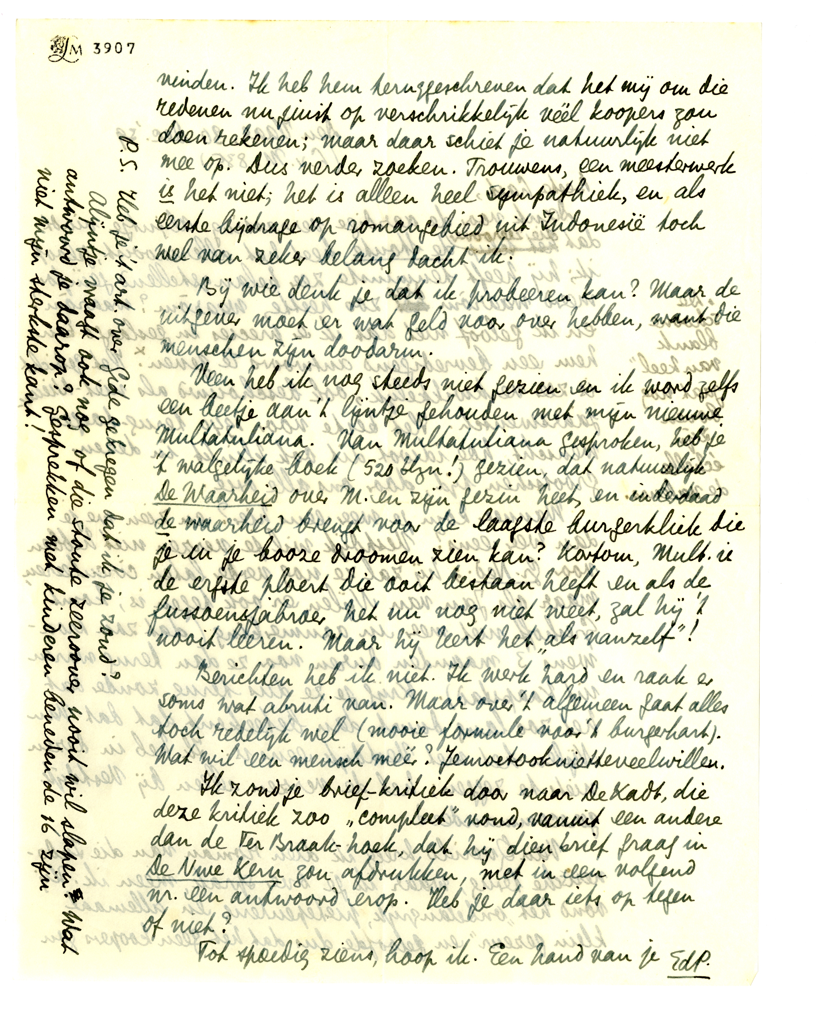 Van Querido kreeg ik dien roman van die Indonesische terug, waar ik je over sprak, meen ik. Hij vond het ‘onbelangrijk, pietepeuterig en allemaal klein gezeur’ en geloofde dus dat het geen koopers zou vinden. Ik heb hem teruggeschreven6563 dat het mij om die redenen nu juist op verschrikkelijk véél koopers zou doen rekenen; maar daar schiet je natuurlijk niet mee op. Dus verder zoeken. Trouwens, een meesterwerk is het niet; het is alleen heel sympathiek, en als eerste bijdrage op romangebied uit Indonesië toch wel van zeker belang dacht ik.
