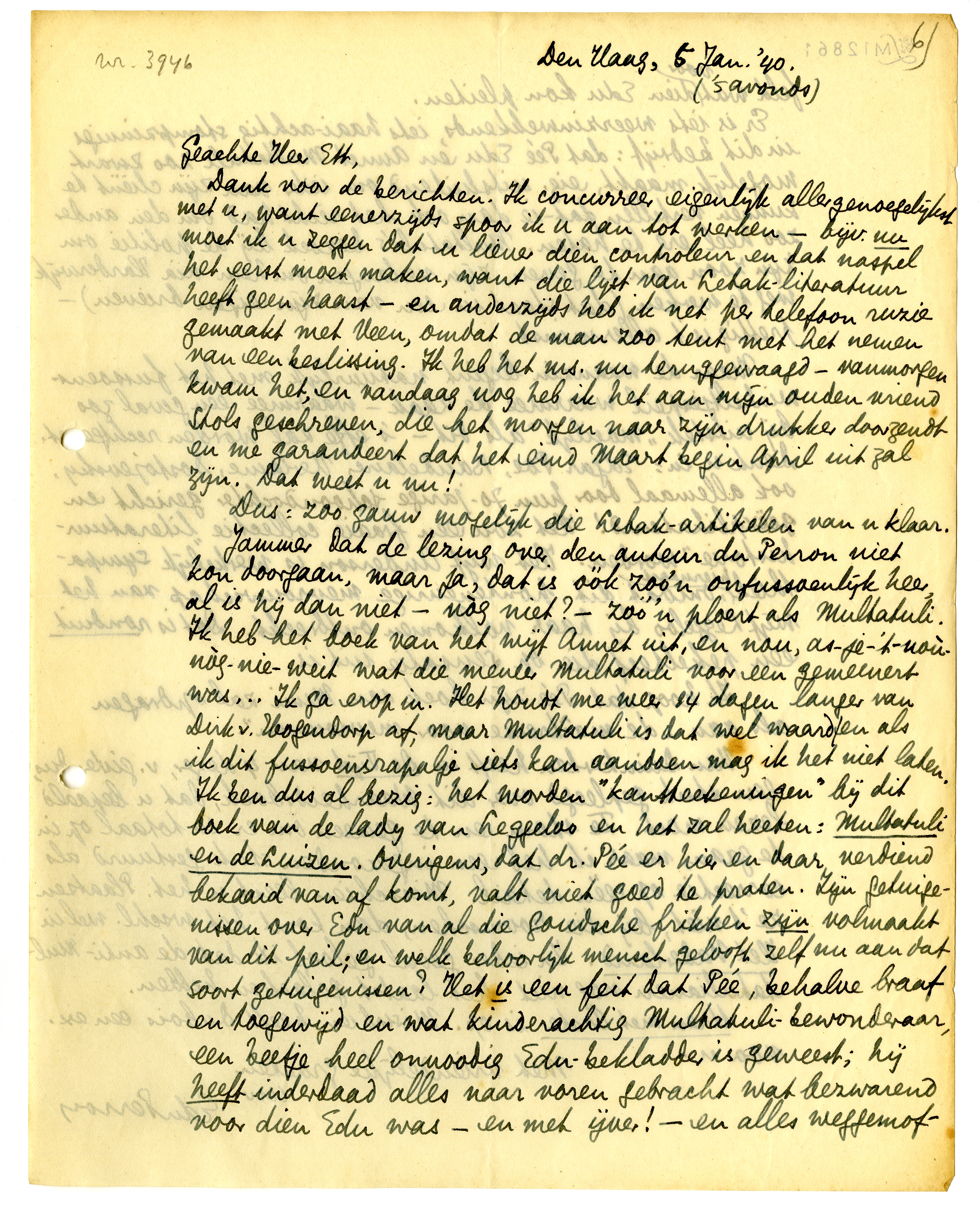 Dank voor de berichten. Ik concurreer eigenlijk allergenoegelijkst met u, want eenerzijds spoor ik u aan tot werken - bijv. nu moet ik u zeggen dat u liever dien controleur en dat naspel het eerst moet maken, want die lijst van Lebak-literatuur heeft geen haast - en anderzijds heb ik net per telefoon ruzie gemaakt met Veen, omdat de man zoo teut met het nemen van een beslissing. Ik heb het ms. nu teruggevraagd - vanmorgen kwam het, en vandaag nog heb ik het aan mijn ouden vriend Stols geschreven,6597 die het morgen naar zijn drukker doorzendt en me garandeert dat het eind Maart begin April uit zal zijn. Dat weet u nu!