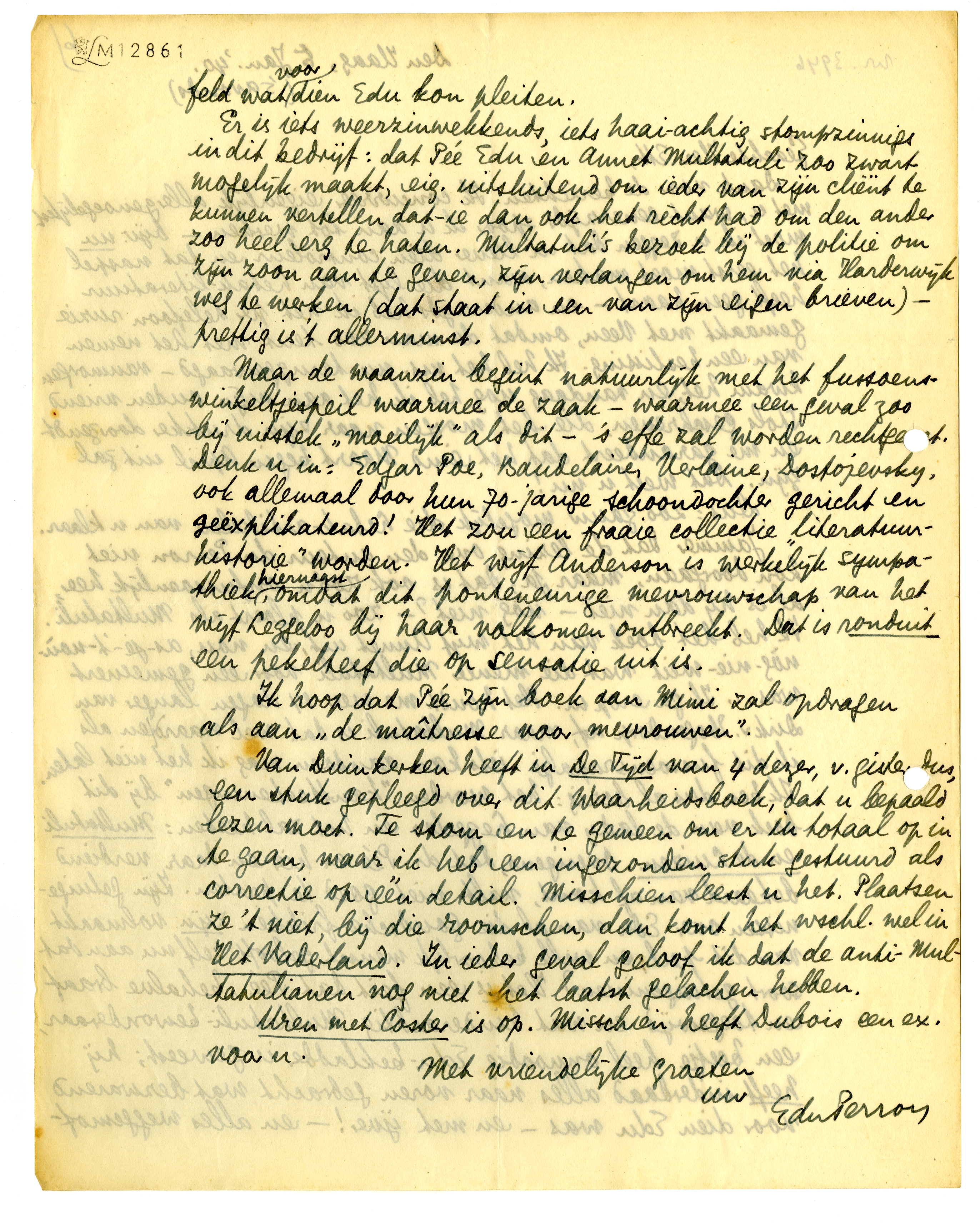 Jammer dat de lezing over den auteur du Perron niet kon doorgaan, maar ja, dat is óók zoo'n onfussoenlijk heer, al is hij dan niet - nòg niet? - zóó'n ploert als Multatuli. Ik heb het boek van het wijf Annet uit, en nou, as je-'t-noù-nòg-nie-weit wat die meneer Multatuli voor een gemeenert was,... Ik ga erop in. Het houdt me weer 14 dagen langer van Dirk v. Hogendorp af, maar Multatuli is dat wel waard en als ik dit fussoensrapalje iets kan aandoen mag ik het niet laten. Ik ben dus al bezig: het worden ‘kantteekeningen’ bij dit boek van de lady van Leggeloo en het zal heeten: Multatuli en de Luizen. Overigens, dat dr. Pée er hier en daar verdiend bekaaid van af komt, valt niet goed te praten. Zijn getuigenissen over Edu van al die goudsche frikken zijn volmaakt van dit peil; en welk behoorlijk mensch gelooft zelf nu aan dat soort getuigenissen? Het is een feit dat Pée, behalve braaf en toegewijd en wat kinderachtig Multatuli-bewonderaar, een beetje heel onnoodig Edu-bekladder is geweest; hij heeft inderdaad alles naar voren gebracht wat bezwarend voor dien Edu was - en met ijver! - en alles weggemoffeld wat voor dien Edu kon pleiten.