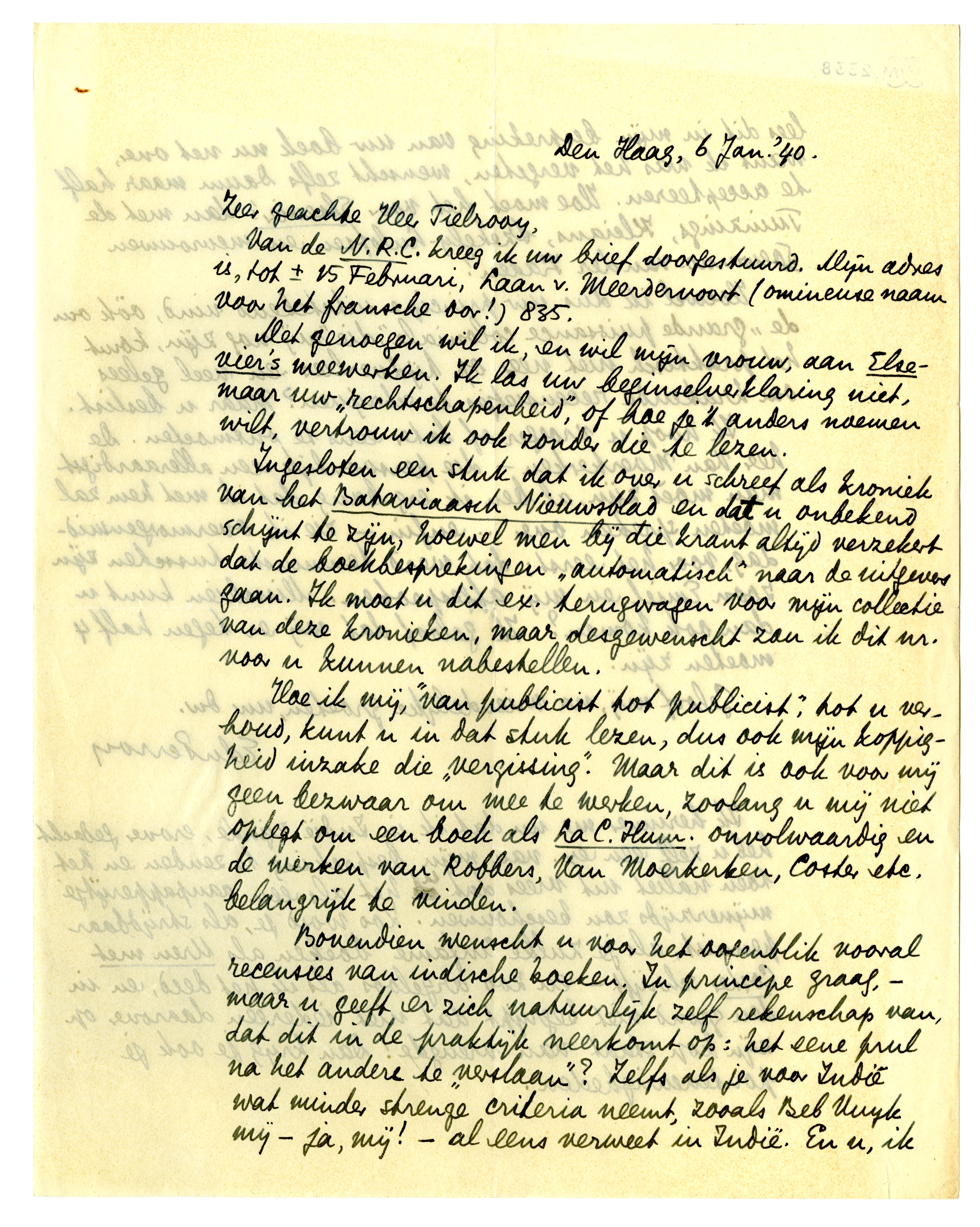 Ingesloten een stuk dat ik over u schreef als kroniek van het Bataviaasch Nieuwsblad6608 en dat u onbekend schijnt te zijn, hoewel men bij die krant altijd verzekert dat de boekbesprekingen ‘automatisch’ naar de uitgevers gaan. Ik moet u dit ex. terugvragen voor mijn collectie van deze kronieken, maar desgewenscht zou ik dit nr. voor u kunnen nabestellen.