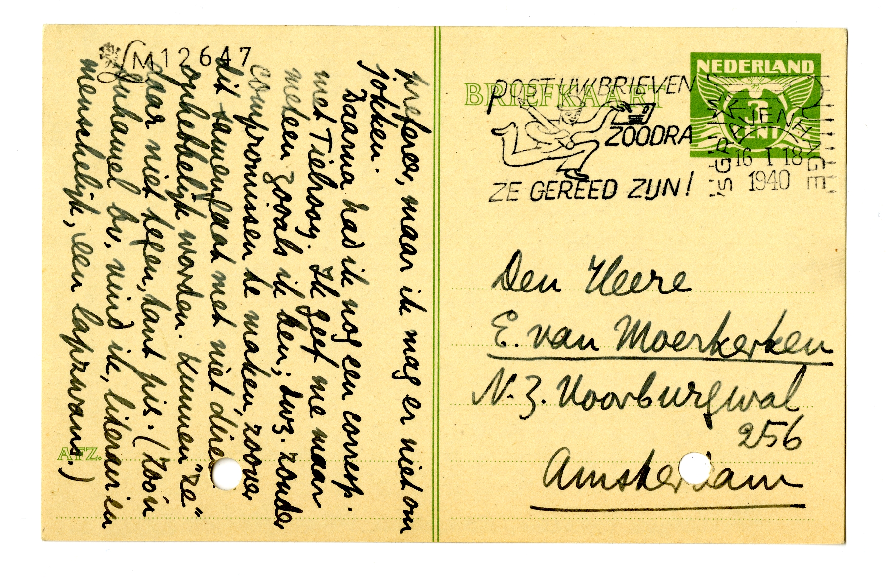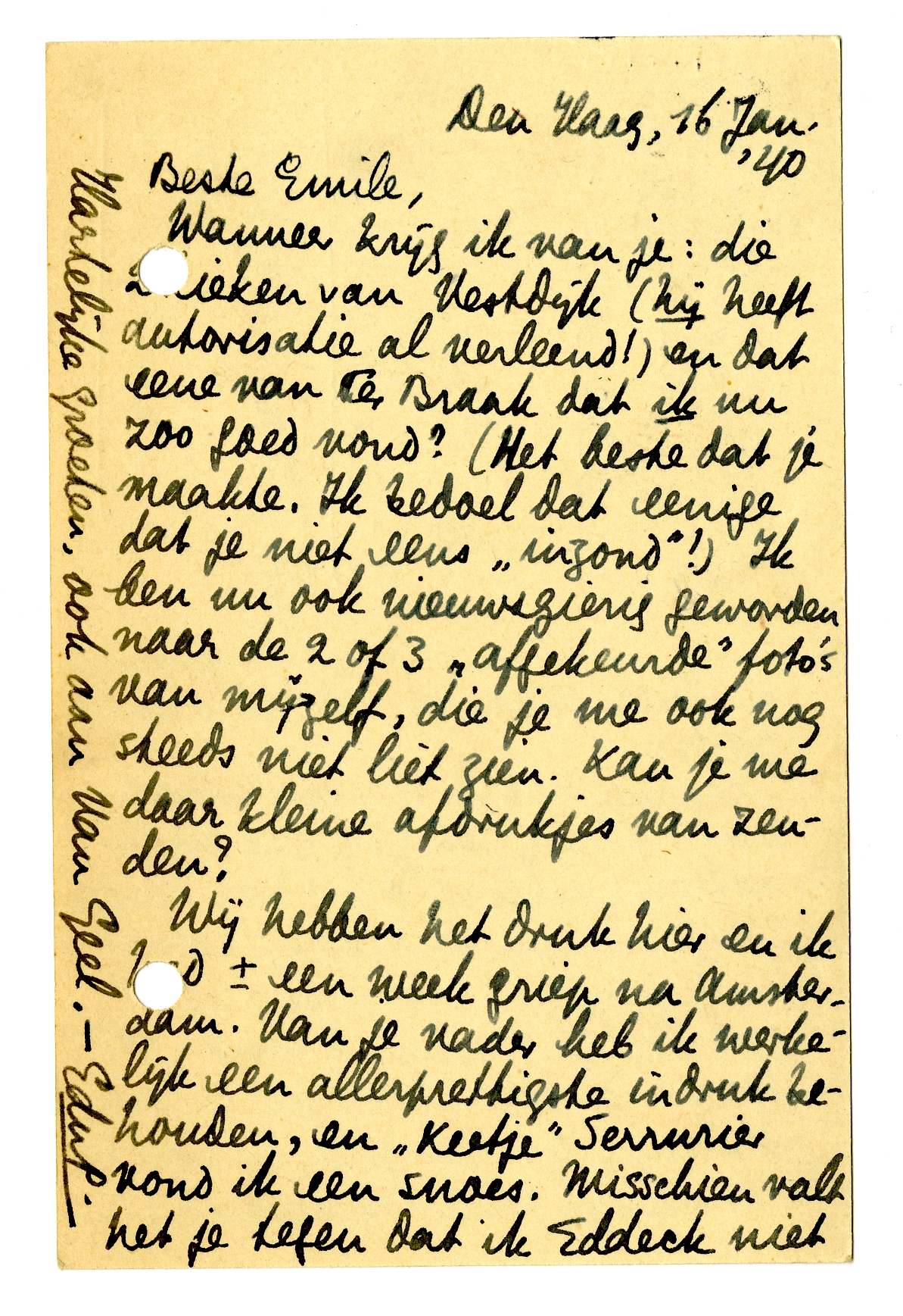 Wanneer krijg ik van je: die 2 kieken van Vestdijk (hij heeft autorisatie al verleend!) en dat eene van Ter Braak dat ik nu zoo goed vond? (Het beste dat je maakte. Ik bedoel dat eenige dat je niet eens ‘inzond’!) Ik ben nu ook nieuwsgierig geworden naar de 2 of 3 ‘afgekeurde’ foto's van mijzelf,6643 die je me ook nog steeds niet liet zien. Kan je me daar kleine afdrukjes van zenden?