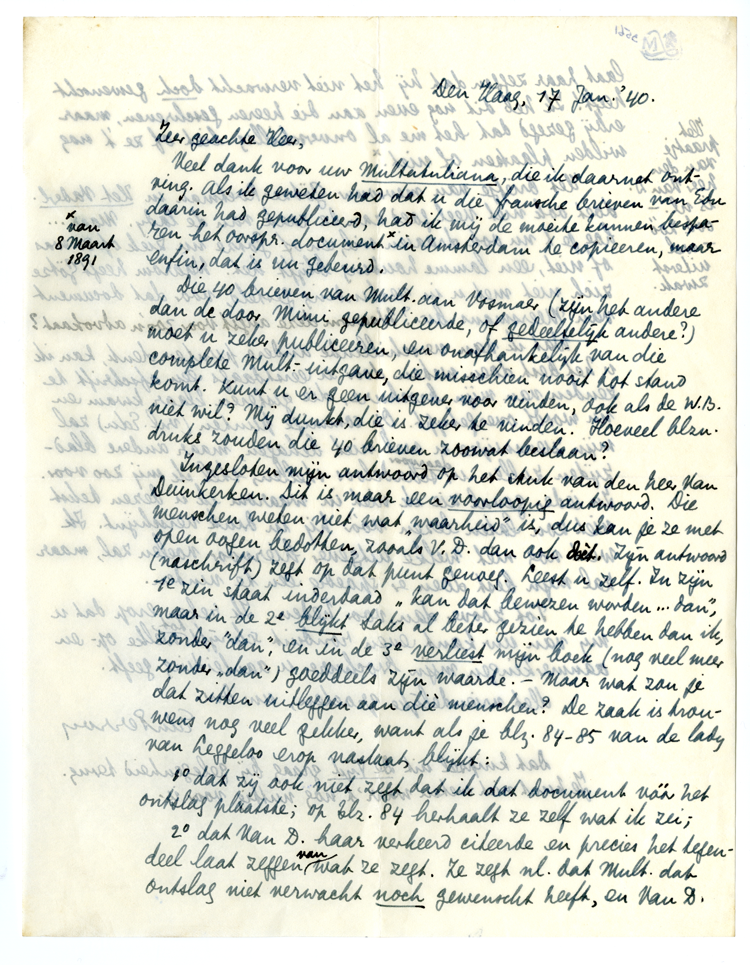 Veel dank voor uw Multatuliana, die ik daarnet ontving. Als ik geweten had dat u die fransche brieven van Edu daarin had gepubliceerd, had ik mij de moeite kunnen besparen het oorspr. document* in Amsterdam te copieeren, maar enfin, dat is nu gebeurd.