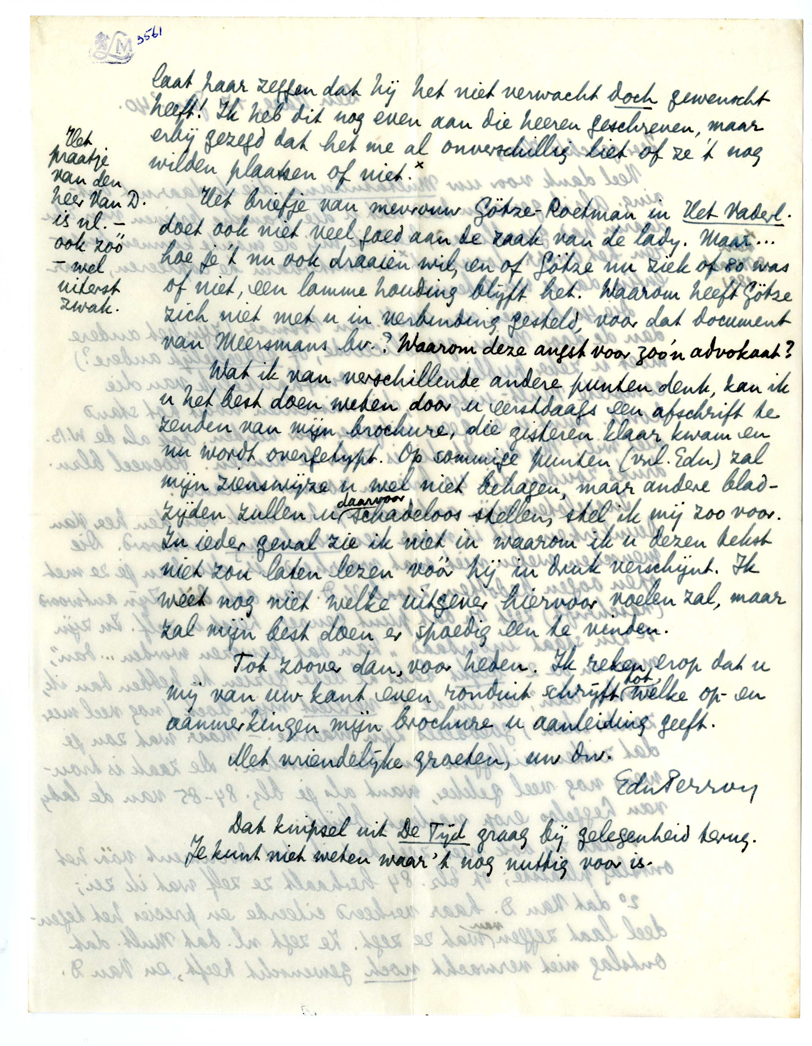Wat ik van verschillende andere punten denk, kan ik u het best doen weten door u eerstdaags een afschrift te zenden van mijn brochure, die gisteren klaar kwam en nu wordt overgetypt. Op sommige punten (vnl. Edu) zal mijn zienswijze u wel niet behagen, maar andere bladzijden zullen u daarvoor schadeloos stellen, stel ik mij zoo voor. In ieder geval zie ik niet in waarom ik u dezen tekst niet zou laten lezen vóór hij in druk verschijnt. Ik weet nog niet welke uitgever hiervoor voelen zal, maar zal mijn best doen er spoedig een te vinden.