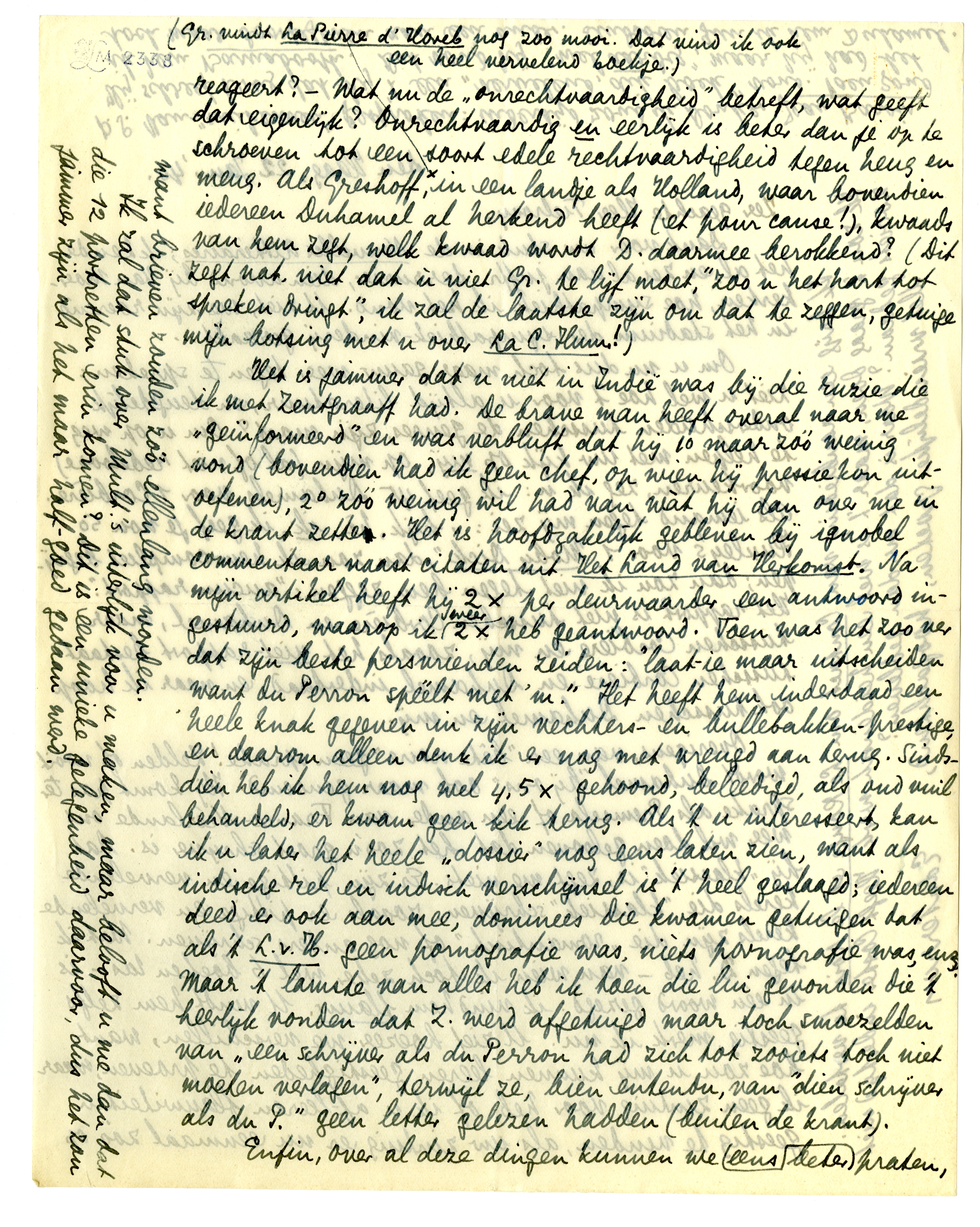 Het is jammer dat u niet in Indië was bij die ruzie die ik niet Zentgraaff had. De brave man heeft overal naar me ‘geïnformeerd’ en was verbluft dat hij 1o maar zóó weinig vond (bovendien had ik geen chef, op wien hij pressie kon uitoefenen), 2o zóó weinig wil had van wàt hij dan over me in de krant zette. Het is hoofdzakelijk gebleven bij ignobel commentaar naast citaten uit Het Land van Herkomst. Na mijn artikel heeft hij 2 × per deurwaarder een antwoord ingestuurd, waarop ik weer 2 × heb geantwoord. Toen was het zoo ver dat zijn beste persvrienden zeiden: ‘laat-ie maar uitscheiden want du Perron spéélt met ‘m’. Het heeft hem inderdaad een heele knak gegeven in zijn vechters- en bullebakken-prestige, en daarom alleen denk ik er nog met vreugd aan terug. Sindsdien heb ik hem nog wel 4, 5 × gehoond, beleedigd, als oud vuil behandeld, er kwam geen kik terug. Als 't u interesseert, kan ik u later het heele ‘dossier’* nog eens laten zien, want als indische rel en indisch verschijnsel is 't heel geslaagd; iedereen deed er ook aan mee, dominees die kwamen getuigen dat als 't L.v.H. geen pornografie was, nièts pornografie was, enz. Maar 't lamste van alles heb ik toen die lui gevonden die 't heerlijk vonden dat Z. werd afgetuigd maar toch smoezelden van ‘een schrijver als du Perron had zich tot zooiets toch niet moeten verlagen’, terwijl ze, bien entendu, van ‘dien schrijver als du P.’ geen letter gelezen hadden (buiten de krant).