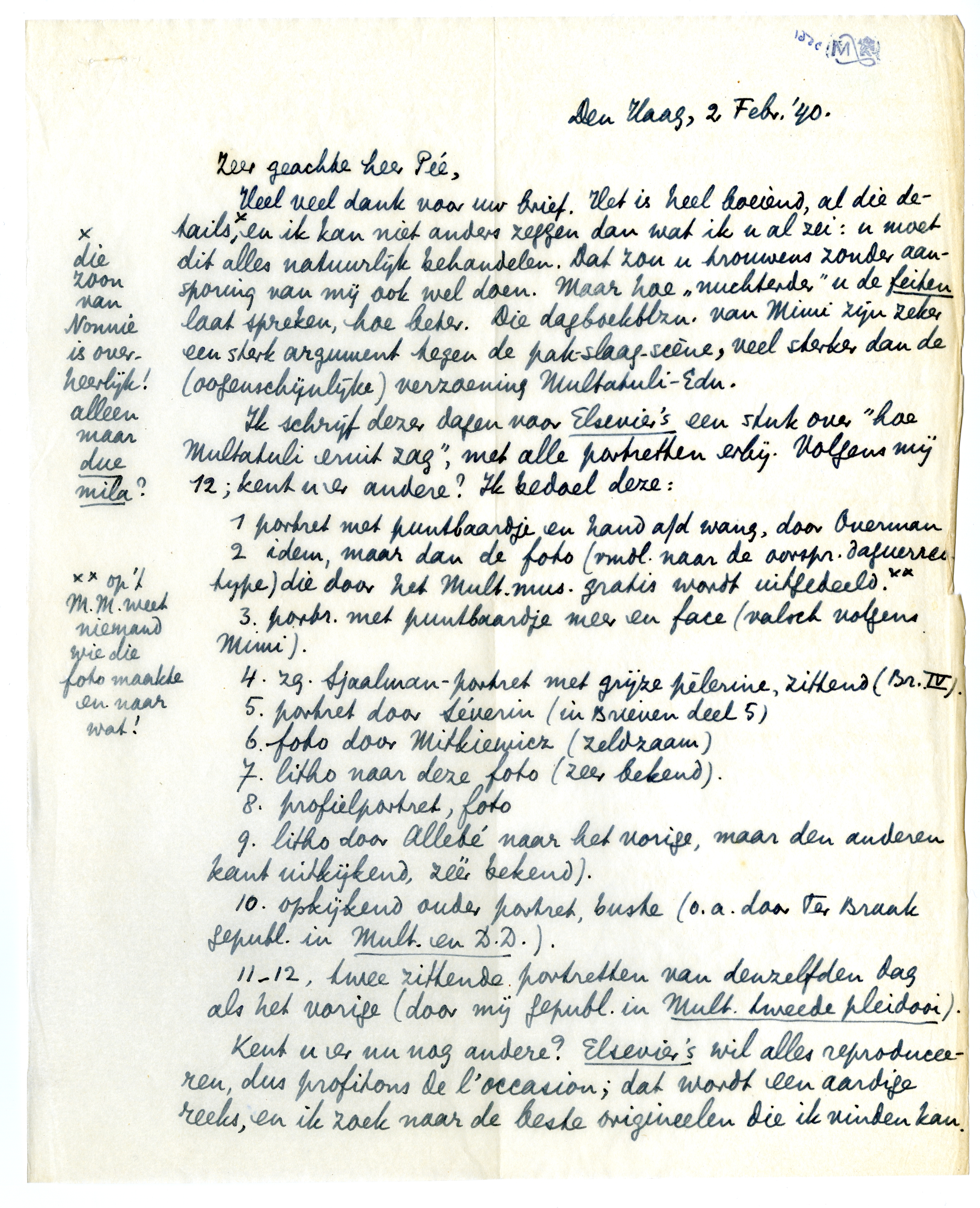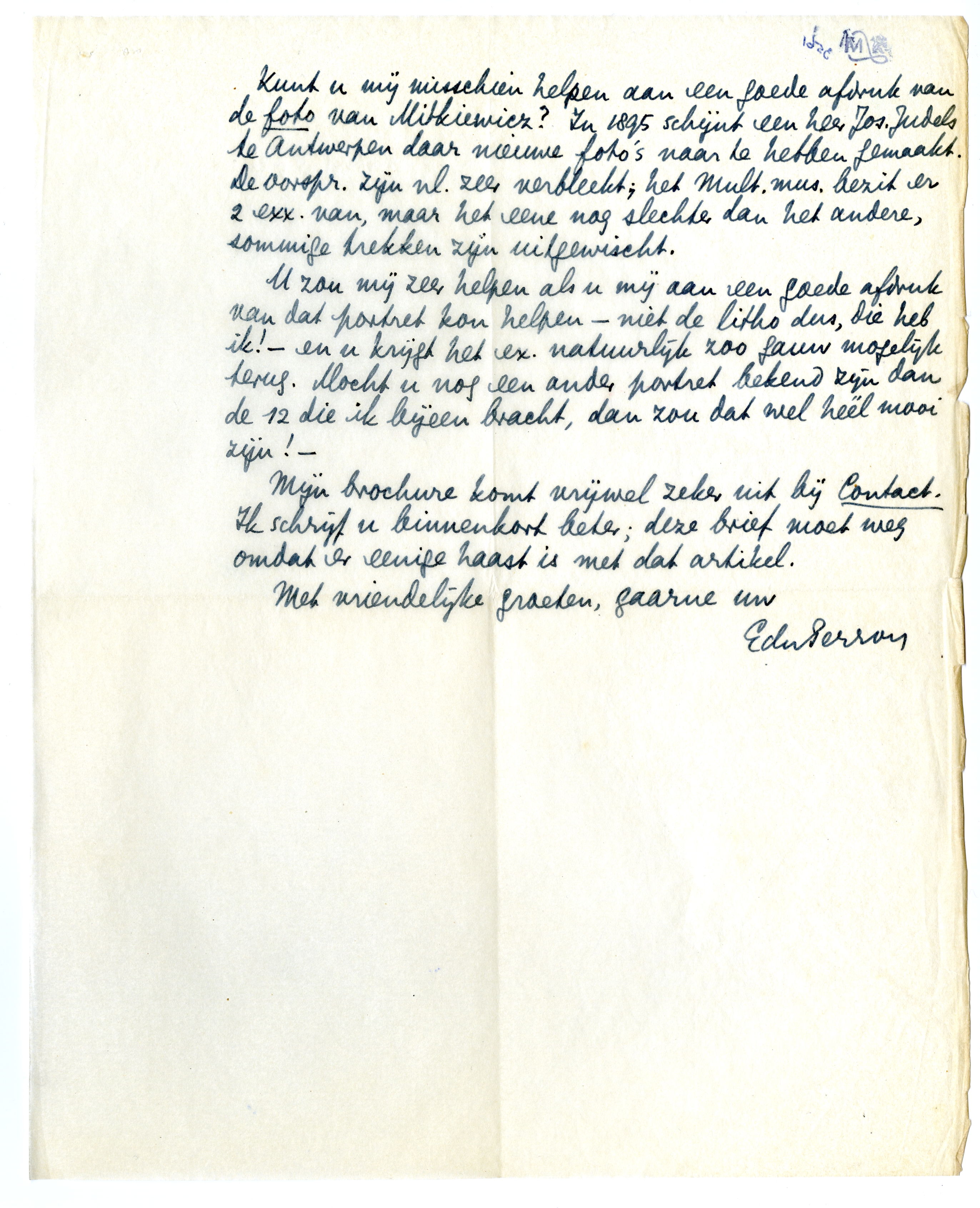 Kent u er nu nog andere? Elsevier's wil alles reproduceeren, dus profitons de l'occasion; dat wordt een aardige reeks, en ik zoek naar de beste origineelen die ik vinden kan. Kunt u mij misschien helpen aan een goede afdruk van de foto van Mitkiewicz? In 1895 schijnt een heer Jos. Judels te Antwerpen daar nieuwe foto's naar te hebben gemaakt. De oorspr. zijn nl. zeer verbleekt; het Mult. mus. bezit er 2 exx. van, maar het eene nog slechter dan het andere, sommige trekken zijn uitgewischt.