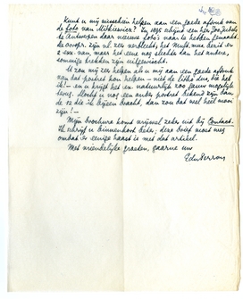 Heel veel dank voor uw brief. Het is heel boeiend, al die details,* en ik kan niet anders zeggen dan wat ik u al zei: u moet dit alles natuurlijk behandelen. Dat zou u trouwens zonder aansporing van mij ook wel doen. Maar hoe ‘nuchterder’ u de feiten laat spreken, hoe beter. Die dagboekblzn. van Mimi zijn zeker een sterk argument tegen de pak-slaag-scène, veel sterker dan de (oogenschijnlijke) verzoening Multatuli-Edu.