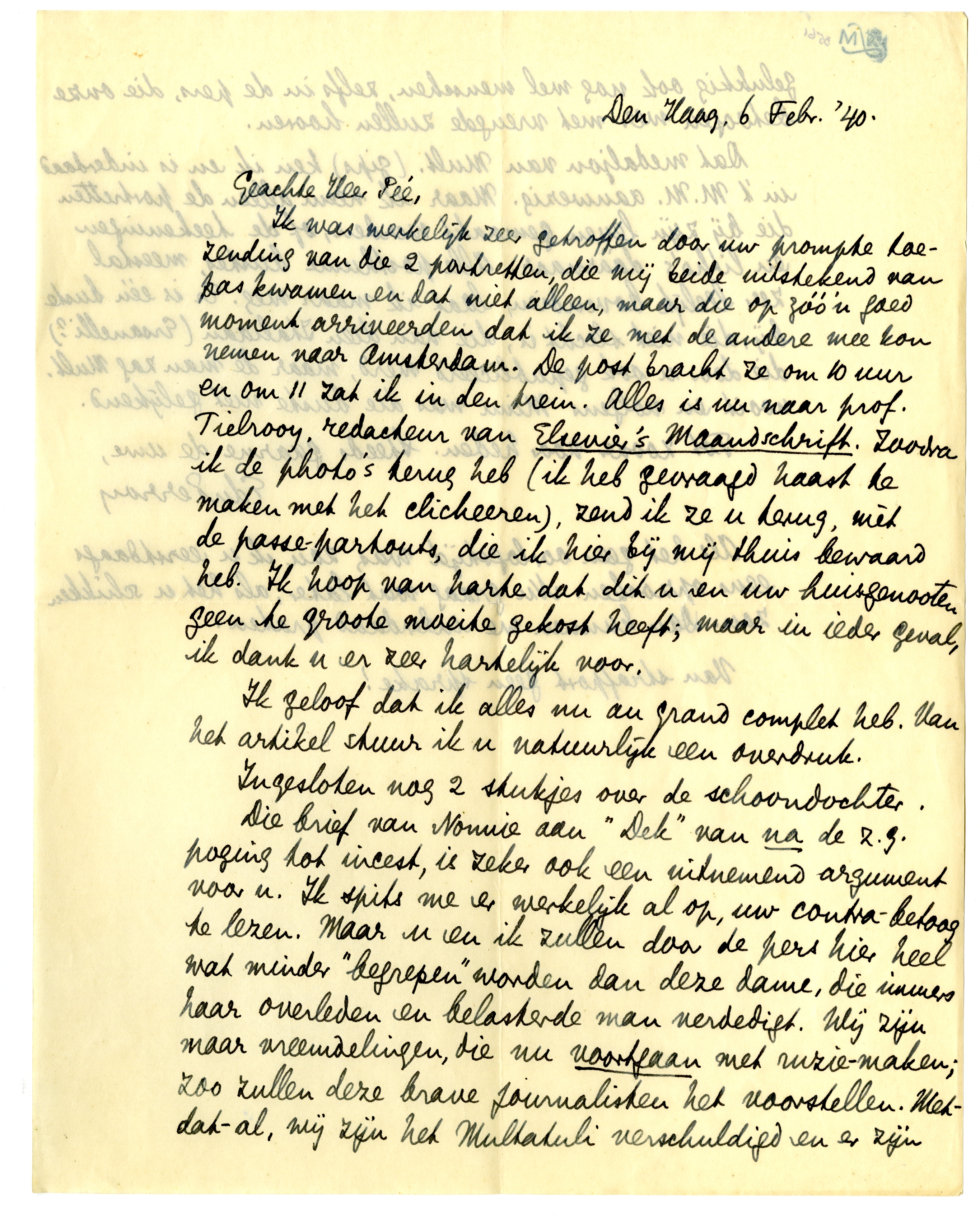 Ik was werkelijk zeer getroffen door uw prompte toezending van die 2 portretten,6709 die mij beide uitstekend van pas kwamen en dat niet alleen, maar die op zóó'n goed moment arriveerden dat ik ze met de andere mee kon nemen naar Amsterdam. De post bracht ze om 10 uur en om 11 zat ik in den trein. Alles is nu naar prof. Tielrooy, redacteur van Elsevier's Maandschrift. Zoodra ik de photo's terug heb (ik heb gevraagd haast te maken met het clicheeren), zend ik ze u terug, mèt de passe-partouts, die ik hier bij mij thuis bewaard heb. Ik hoop van harte dat dit u en uw huisgenooten geen te groote moeite gekost heeft; maar in ieder geval, ik dank u er zeer hartelijk voor.