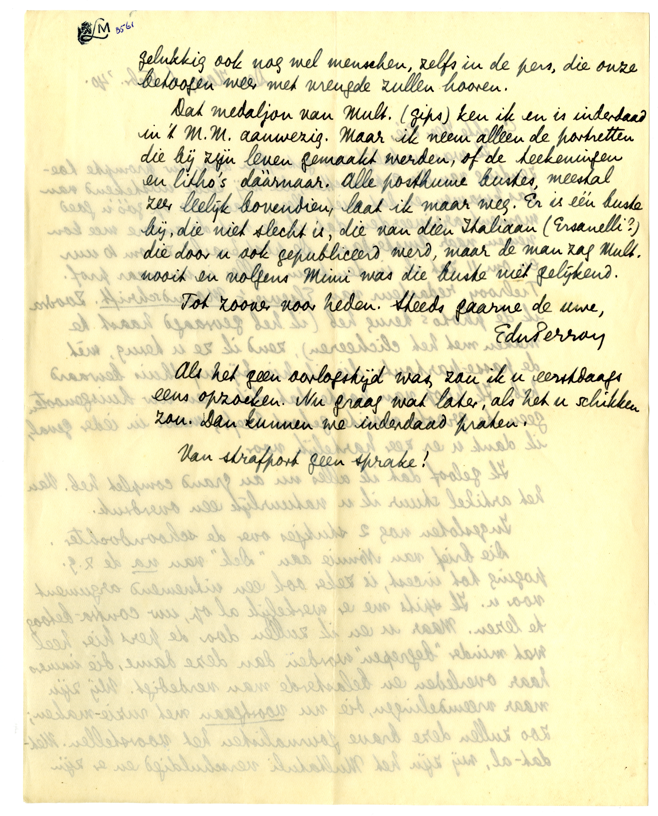 Dat medaljon van Mult. (gips)6711 ken ik en is inderdaad in 't M.M. aanwezig. Maar ik neem alleen de portretten die bij zijn leven gemaakt werden, of de teekeningen en litho's dààrnaar. Alle posthume bustes, meestal zeer leelijk bovendien, laat ik maar weg. Er is één buste bij, die niet slecht is, die van dien Italiaan (Ersanelli?)6712 die door u ook gepubliceerd werd, maar de man zag Mult. nooit en volgens Mimi was die buste niet gelijkend.