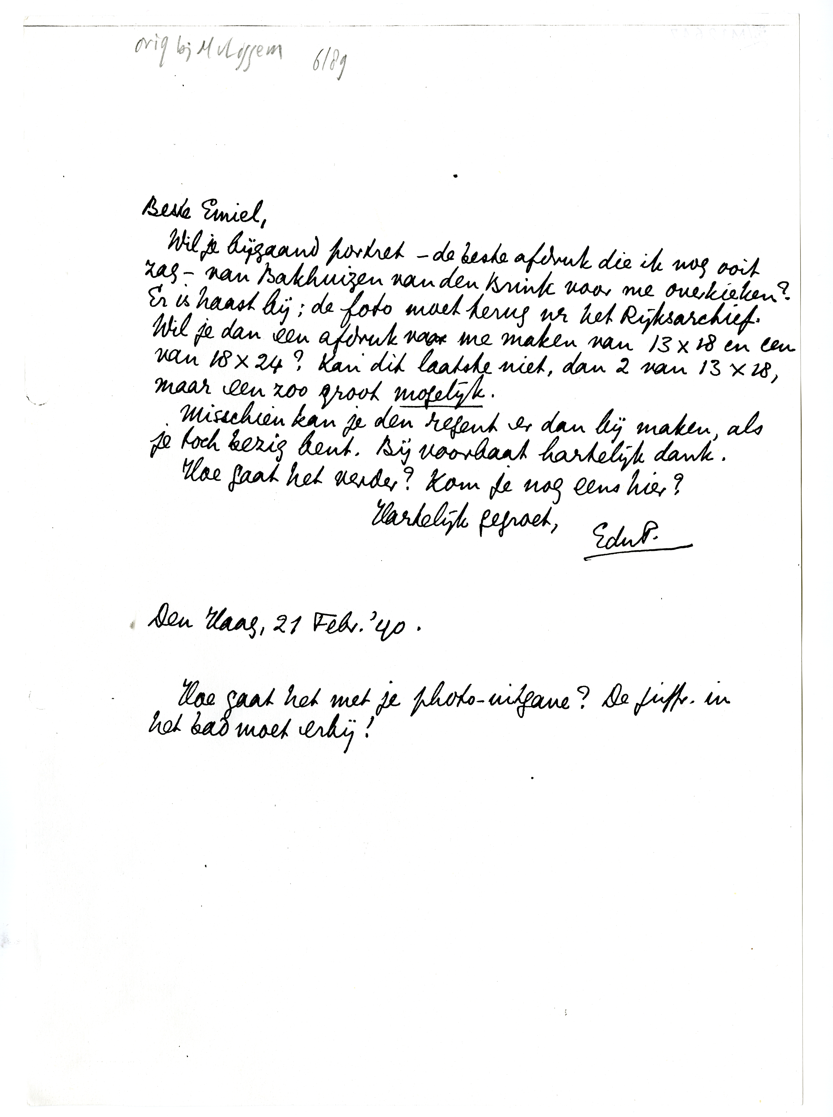 Wil je bijgaand portret - de beste afdruk die ik nog ooit zag - van Bakhuizen van den Brink voor me overkieken? Er is haast bij; de foto moet terug nr het Rijksarchief. Wil je dan een afdruk voor me maken van 13 × 18 en een van 18 × 24? Kan dit laatste niet, dan 2 van 13 × 18, maar een zoo groot mogelijk.
